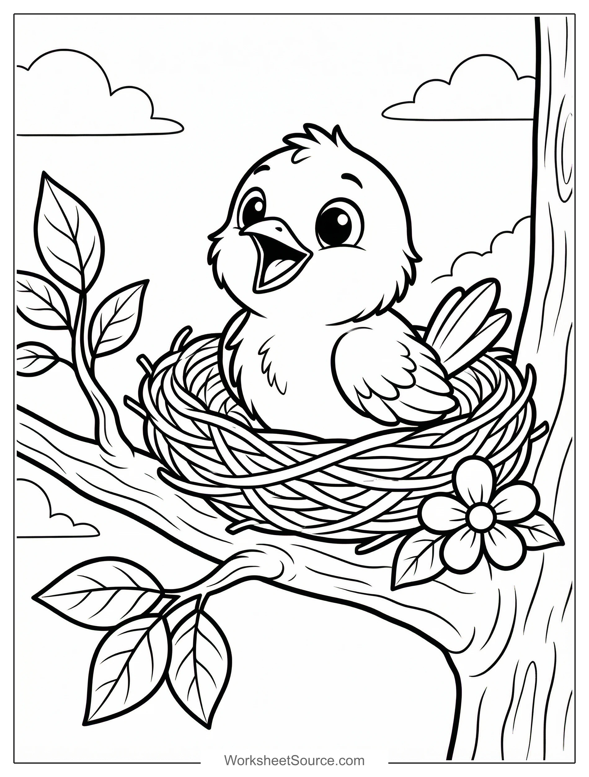 Try soft yellow or pale orange for the baby bird body, and a slightly darker shade for feather edges to show texture. Color the nest with browns and a little gray, and add green leaves and a blue sky to make the scene pop. Use light strokes for the belly, and darker strokes along wing lines to add depth and a fluffy look.
