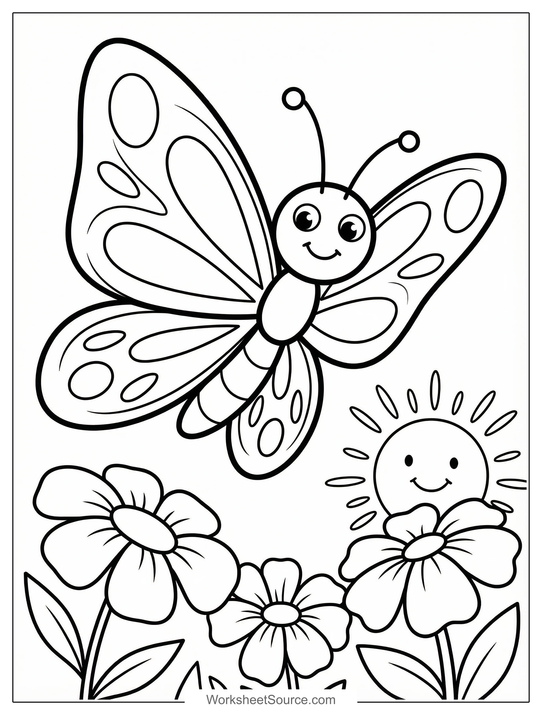 Download this free printable Flying Butterfly coloring page for kids, great for classroom activities, home learning, and creative fun.