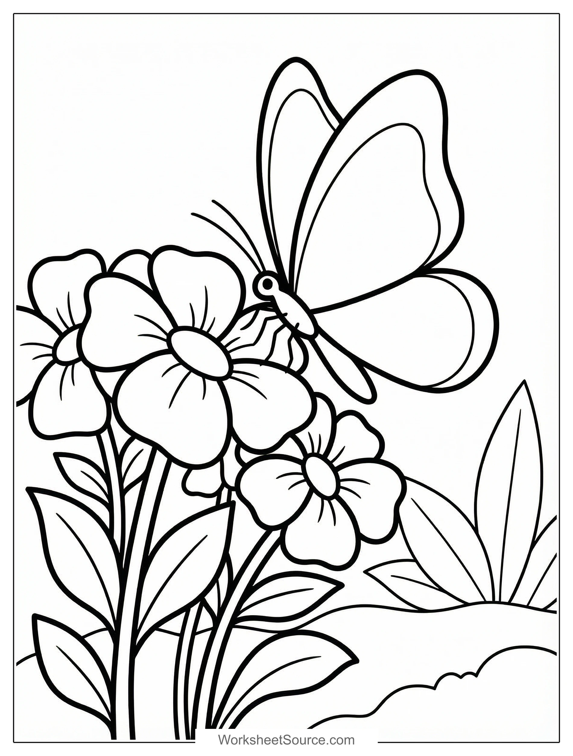 Download this free printable Graceful Butterfly on Flowers coloring page for kids. Great for classroom activities, home learning, and creative fun.