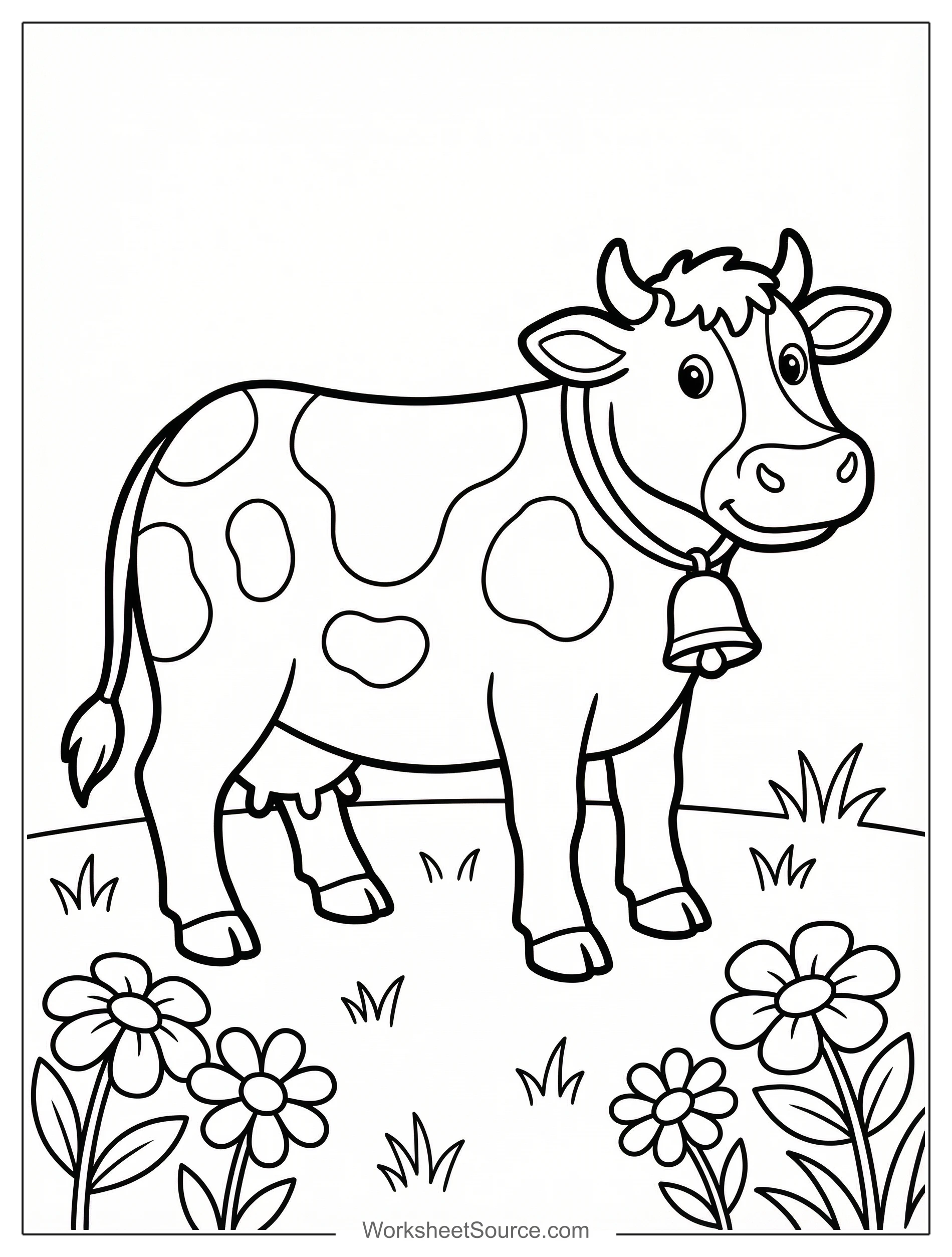 Use warm brown or classic black and white for the cow spots, and soft tan for the body. Color the bell gold, and add light gray shading under the belly and legs to show shadow. Make the grass different greens, and use bright colors for the flowers to make the pasture pop.