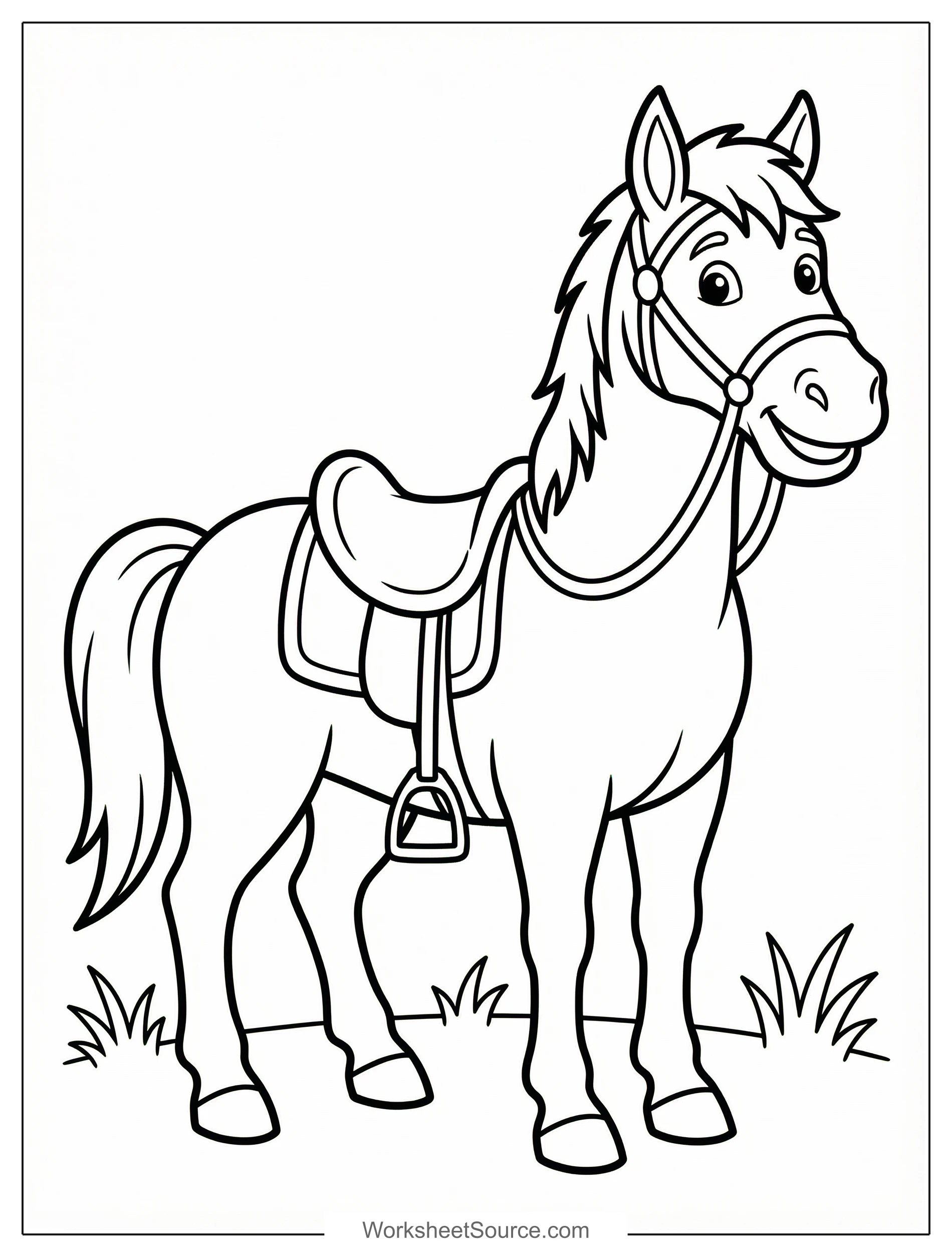 Download this free printable Horse With Saddle coloring page for kids, great for classroom activities, home learning, and creative fun.