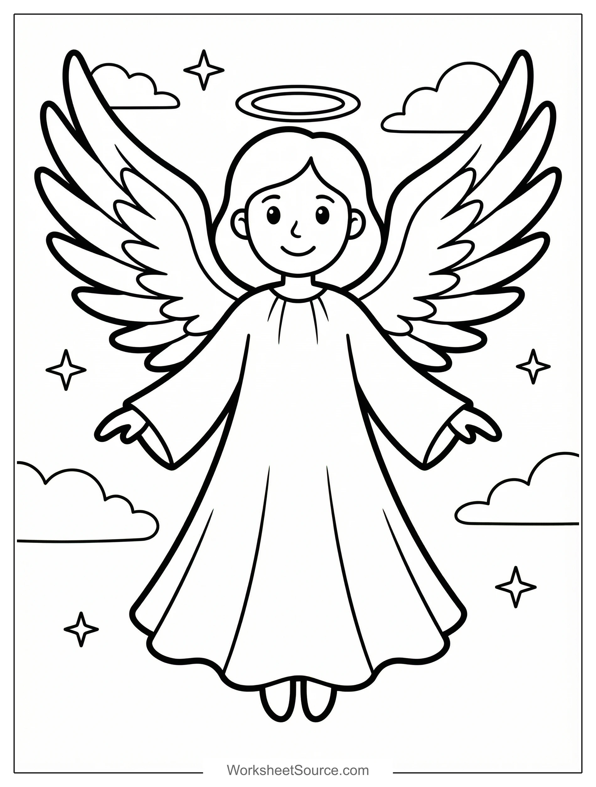 Try soft gold or yellow for the halo to make it glow, and use pale blues or pinks for the robe to create a gentle look. Color the wings with layered strokes using light gray and white highlights to show feather texture, and add tiny silver or glitter accents for festive sparkle.
