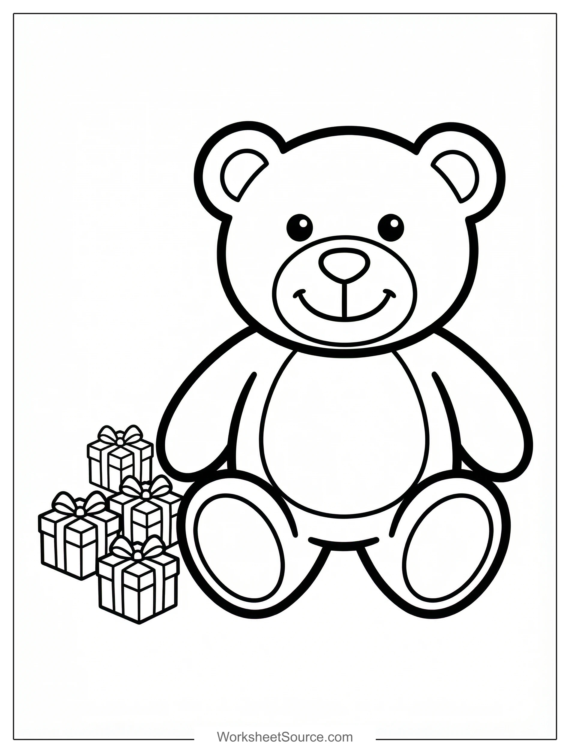 Try coloring the small presents in bright red, green, and gold to make them pop. Add light shading with a darker color along one side of each gift to show depth, and add ribbon highlights with white or yellow. For the teddy bear, try warm browns for the fur and a soft pink for the ears and nose to make it friendly.