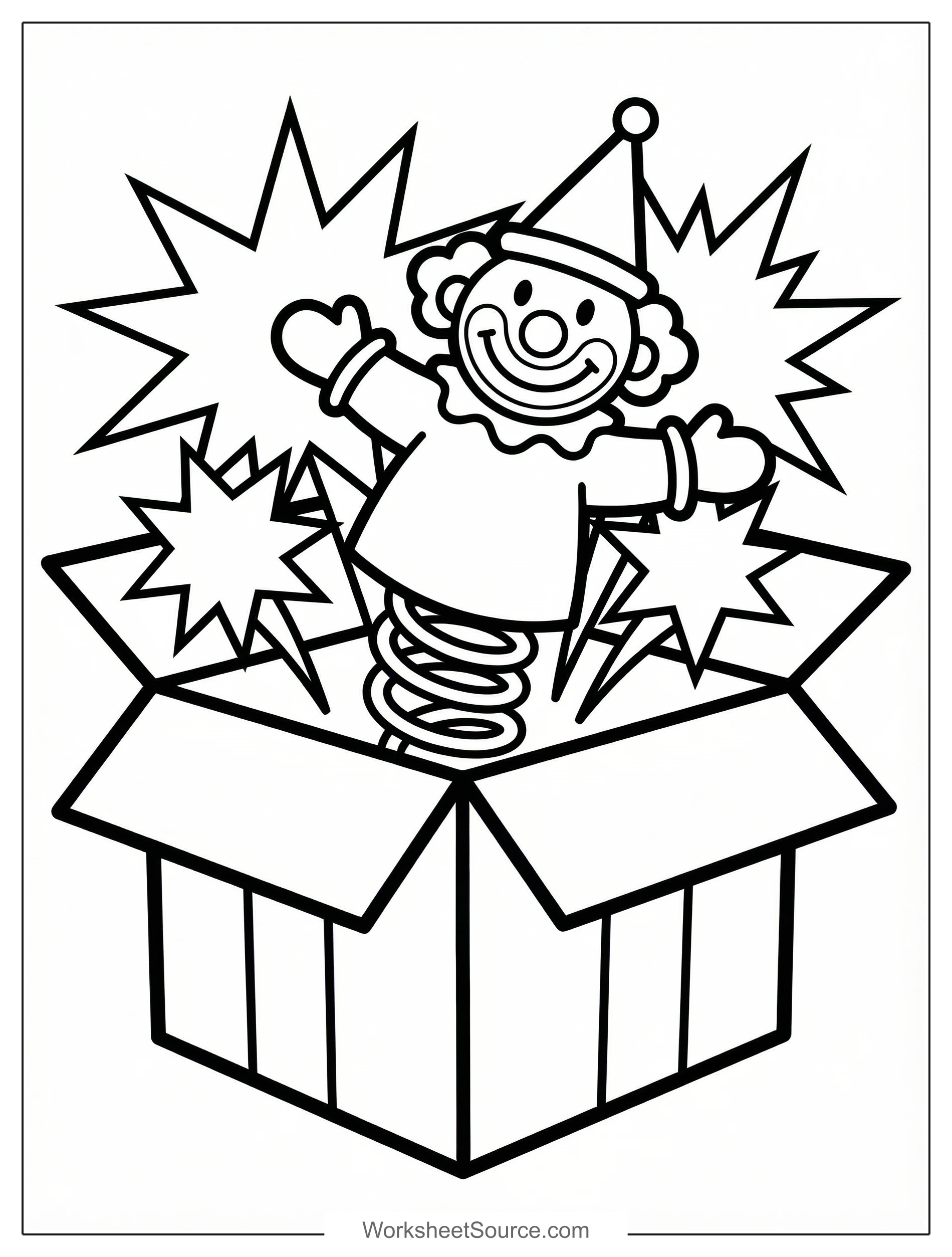 Surprise Present coloring page fun brings a burst of holiday excitement to coloring time. Imagine opening a box and finding a cheerful jack in the box ready to spring out. That moment is what makes this page special. The box panels offer straight lines that are great for practicing careful coloring, while the star bursts invite bold color choices and creative patterns. In a classroom you can use this printable for a festive center, hang finished pages on a bulletin board, or turn it into a group project where each child colors one element. At home it is perfect for rainy afternoons, family craft time, and quiet creative breaks. For a creative extension, have children write a short surprise story to go with their picture, or add glitter and collage pieces for texture. Encourage experimenting with shading on the clown face and box edges to show dimension and light. This printable surprise present coloring page is free, fun, and full of imaginative possibilities.