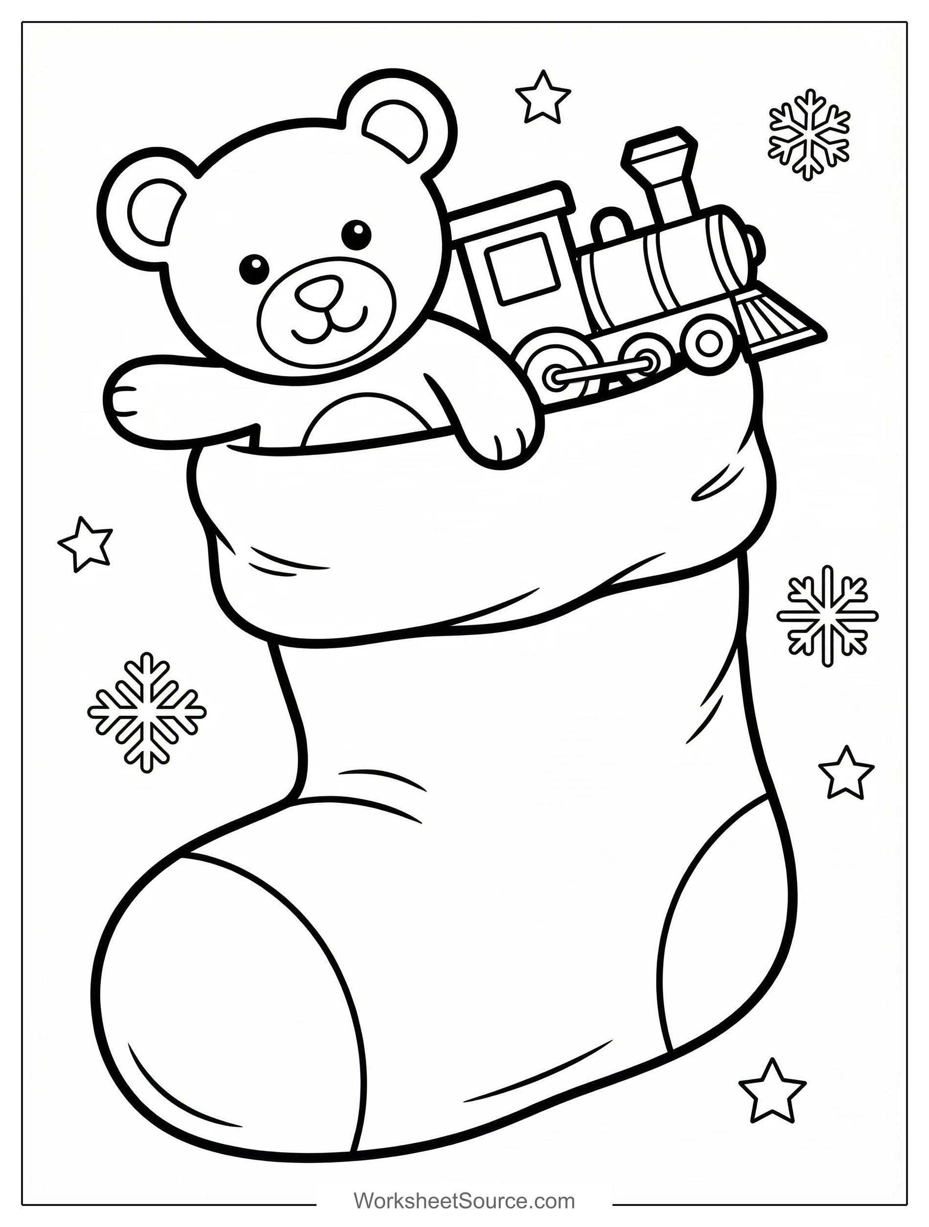 Imagine pulling a cozy stocking from a fireplace and finding a cuddly teddy and a shiny toy train inside. The Stocking Full of Toys coloring page is a festive scene that invites imaginative storytelling and color exploration. Children can decide if the stocking is made of velvet or wool, and choose colors that show texture, like deep red for plush fabric or bright green for playful holiday cheer. In the classroom, use this printable in an art center, hang finished pages on a bulletin board, or pair the sheet with a short story about holiday surprises. At home, coloring can be a calming activity during rainy afternoons, a way to practice focus during quiet time, or a family activity around the table. For creative extensions, try writing a short gift list inspired by the toys, cutting out the colored stocking to make a greeting card, or turning several colored stockings into a festive garland. This printable is free and ready to spark seasonal fun and hands-on creativity.