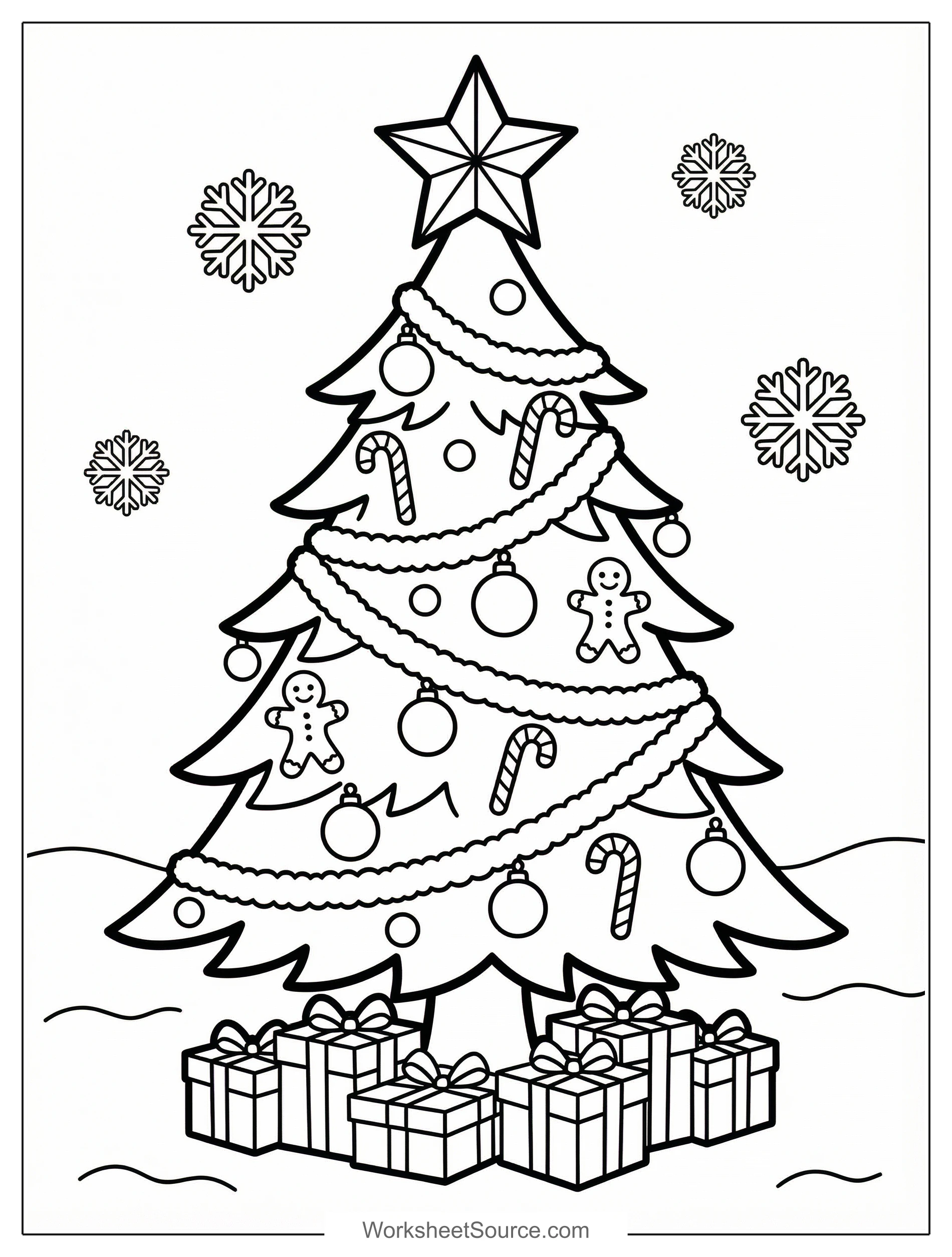 Is there anything more cheerful than a decorated tree topped with a shining star? The Decorated Christmas Tree With Star coloring page is a joyful scene to bring into classrooms and homes. The layers of branches, the garlands, candy canes, and gingerbread shapes give kids lots of chances to practice color decisions and pattern making. Try a classroom center where each child colors one ornament, then combine them to create a collaborative mural. At home, this page works well for a rainy afternoon, or pair it with a story about holiday traditions to spark conversation. For a fun extension, invite children to write a short caption about who will receive the wrapped gifts beneath the tree, or challenge them to invent a new ornament and sketch it beside the original design. Teachers can use the finished pages to decorate a seasonal bulletin board, or create a matching game by cutting out ornaments. This printable is free and easy to copy, and it encourages imagination, creativity, and a little holiday planning all in one cheerful activity.