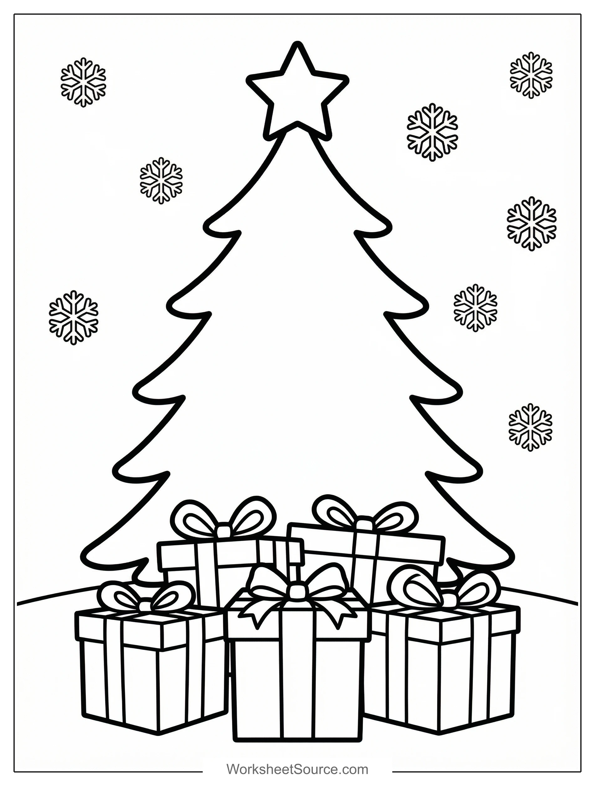 Download this free printable Presents Under Tree coloring page for kids. It is great for classroom activities, home learning, and creative fun.
