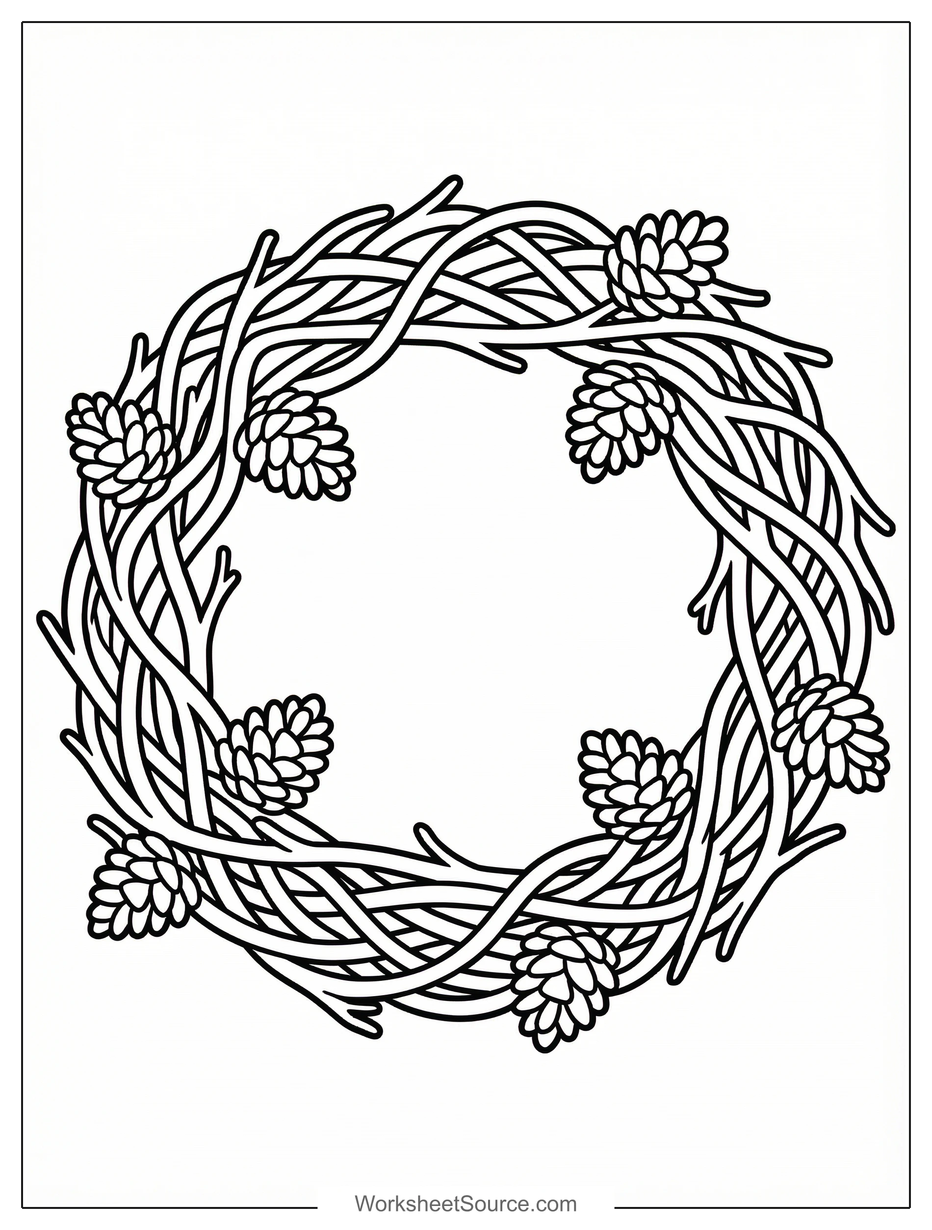 Use warm brown tones for the twigs, and a few shades of brown for the pine cones to show texture. Add touches of green for any needles or leaves, and try light gray or soft blue in the background to make the wreath pop. Color the cones with small strokes around each scale to give them depth, and blend slightly darker edges to suggest shadow.