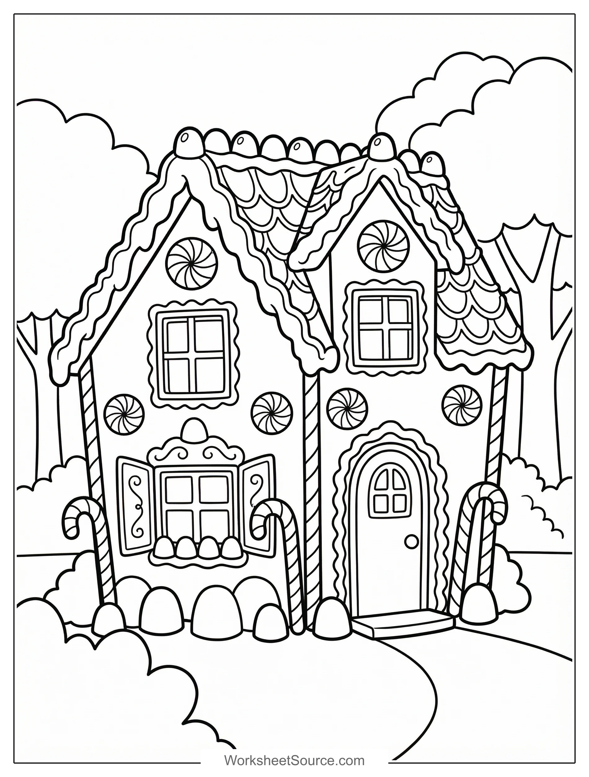 Coloring an Elaborate Gingerbread House coloring page is a joyful way to bring holiday imagination to life, printable and free for busy parents and teachers. Picture the scalloped roof edges, the candy round windows, and the striped candy canes standing guard by the door. Those little details invite discussion about shapes, patterns, and symmetry as children choose colors and create repeating designs. In a classroom center, this page can spark cooperative projects, where small groups pick a color palette and explain their choices. At home, it makes a cozy rainy day activity, perfect for family art time and storytelling about who might live in the house. Try pairing the printable with a short creative writing prompt, have kids name the gingerbread family and describe a day in their life. For a bulletin board display, mount finished pages on colored paper and label them with student titles. This coloring experience blends festive play with observational skills, and it encourages careful coloring, pattern recognition, and confident creative choices.