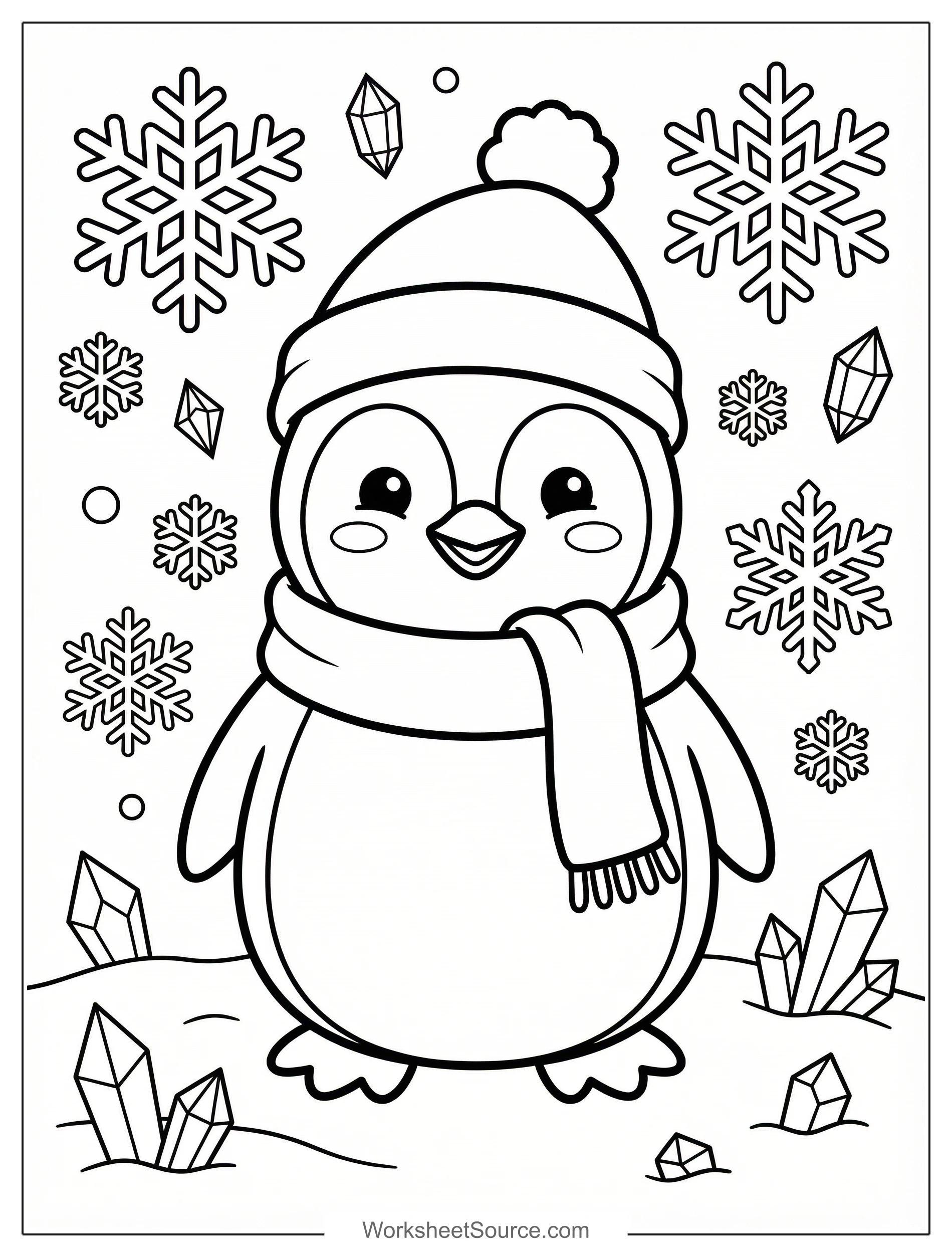 Use light blues and icy purples for the snowflakes and winter crystals to give a frosty look, and add white highlights with a gel pen to make them sparkle. Color the penguin with soft grays for texture and bright orange for the beak and feet, and add rosy pink cheeks. Use gentle circular strokes for smooth shading. Try layering a darker blue around the edges of each crystal and blend outward to create a glowing effect.