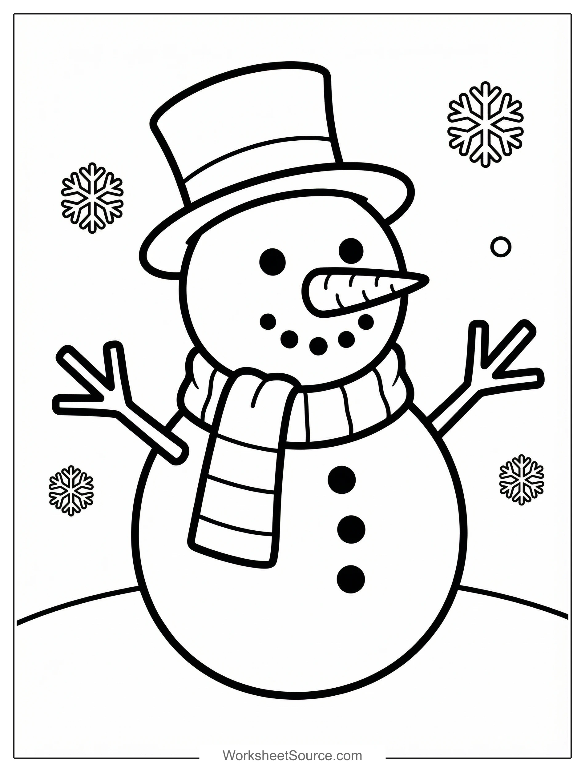Download this free printable Snowman With Scarf and Top Hat coloring page for kids. Great for classroom activities, home learning, and creative fun.