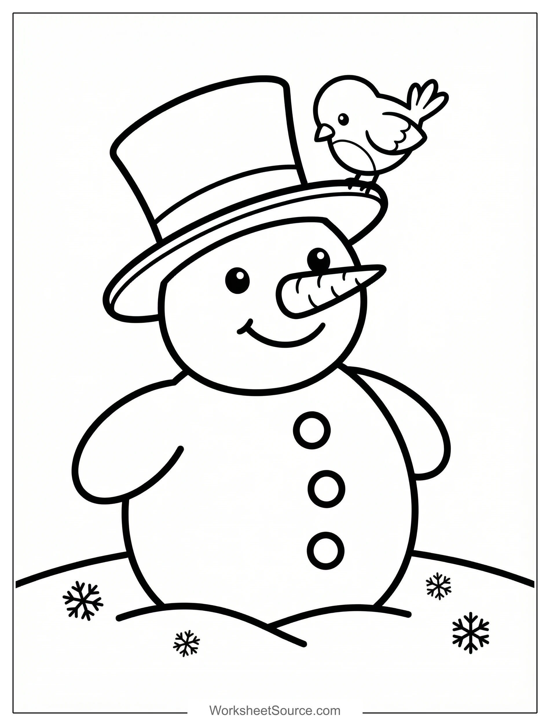 Download this free printable Snowman With Bird coloring page for kids. It is great for classroom activities, home learning, and creative fun.