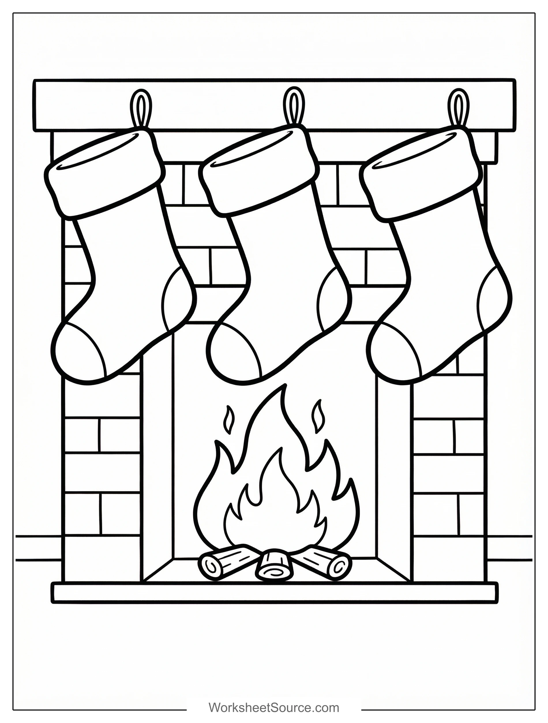 There is something cozy about a row of stockings hanging above a fireplace, and coloring this scene brings that warm feeling to life. Talk about what traditions your family enjoys while kids color the cuffs, toes, and heels of each stocking. The bricks of the fireplace offer a chance to practice patterns and shading, and the flickering flames invite experiments with yellow, orange, and a touch of red. In a classroom, you could turn this into a bulletin board display, have each child design a unique stocking to hang, and compare color choices. At home, this printable is perfect for a quiet afternoon or a holiday craft time with family, and you can add glitter or cotton for texture. For an extension activity, try writing a short story about who uses each stocking, or pair the page with a book about holiday traditions. This printable is free, easy to copy, and fun to share during seasonal centers and family time.