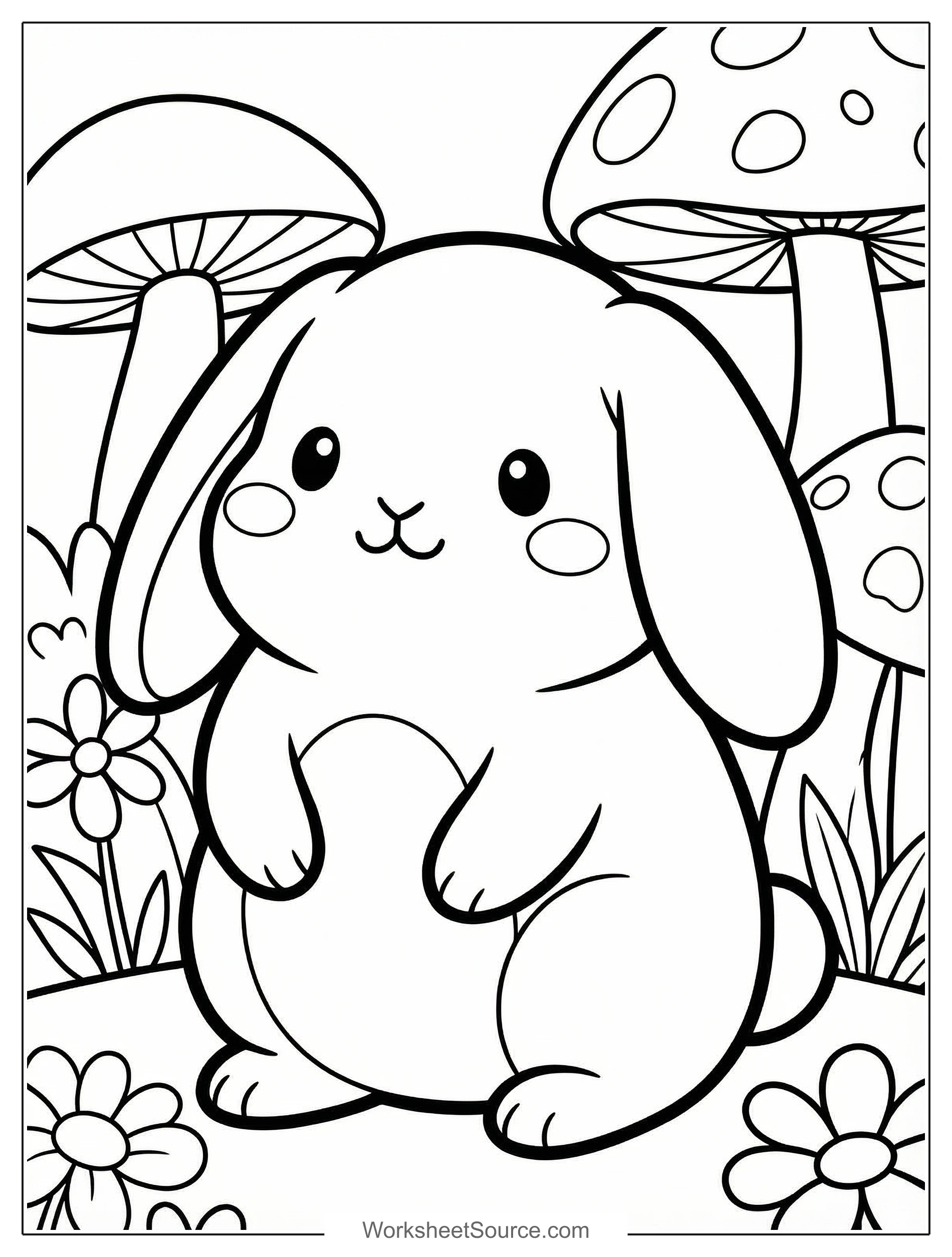 What a delightful Kawaii Bunny coloring page. This simple image invites big imagination and sweet details to explore. Start by talking about the bunny in the picture and look at its round belly, long ears, and friendly face. Coloring the cheeks a soft pink and the ears a warm shade brings the character to life, while bright mushrooms and flowers make a colorful scene. Use this printable in a classroom center, hang finished pages on a bulletin board, or hand them out for a calm rainy day activity at home. Turn it into a storytelling prompt by asking children to name the bunny, describe its day, and imagine where it lives. For a group project, try a color palette swap where each child uses a different set of colors and then compare the results. Pair the page with a short read aloud about rabbits or a nature walk to find real-life inspiration. This Kawaii Bunny coloring page is printable and free, and it makes an easy and joyful activity for families and teachers to share.