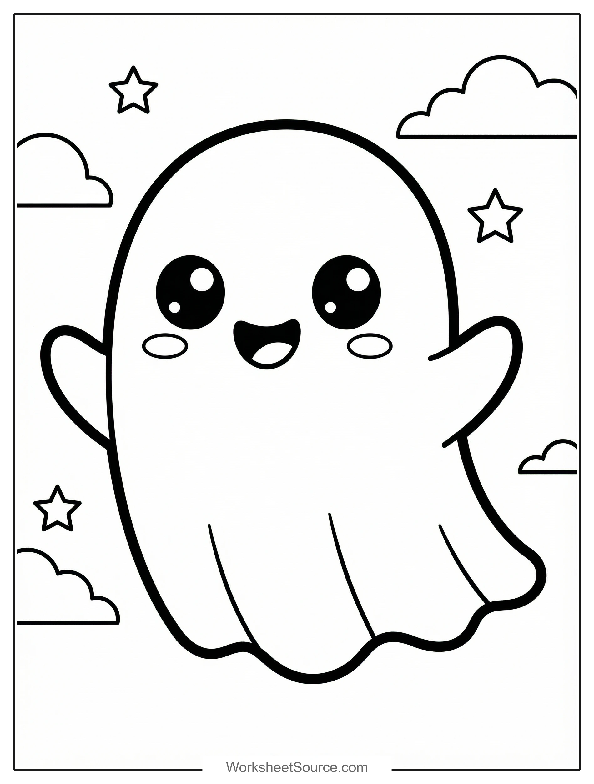 Try soft pastel purples and blues for the ghost to make it look sweet and friendly, add pink cheeks for a kawaii look, and color the eyes glossy black with white highlights to make them pop. Use a light gray along the bottom edge to show a shadow and blend gently to add a sense of depth. Color the stars bright yellow and the clouds pale pink or blue to create a dreamy background.