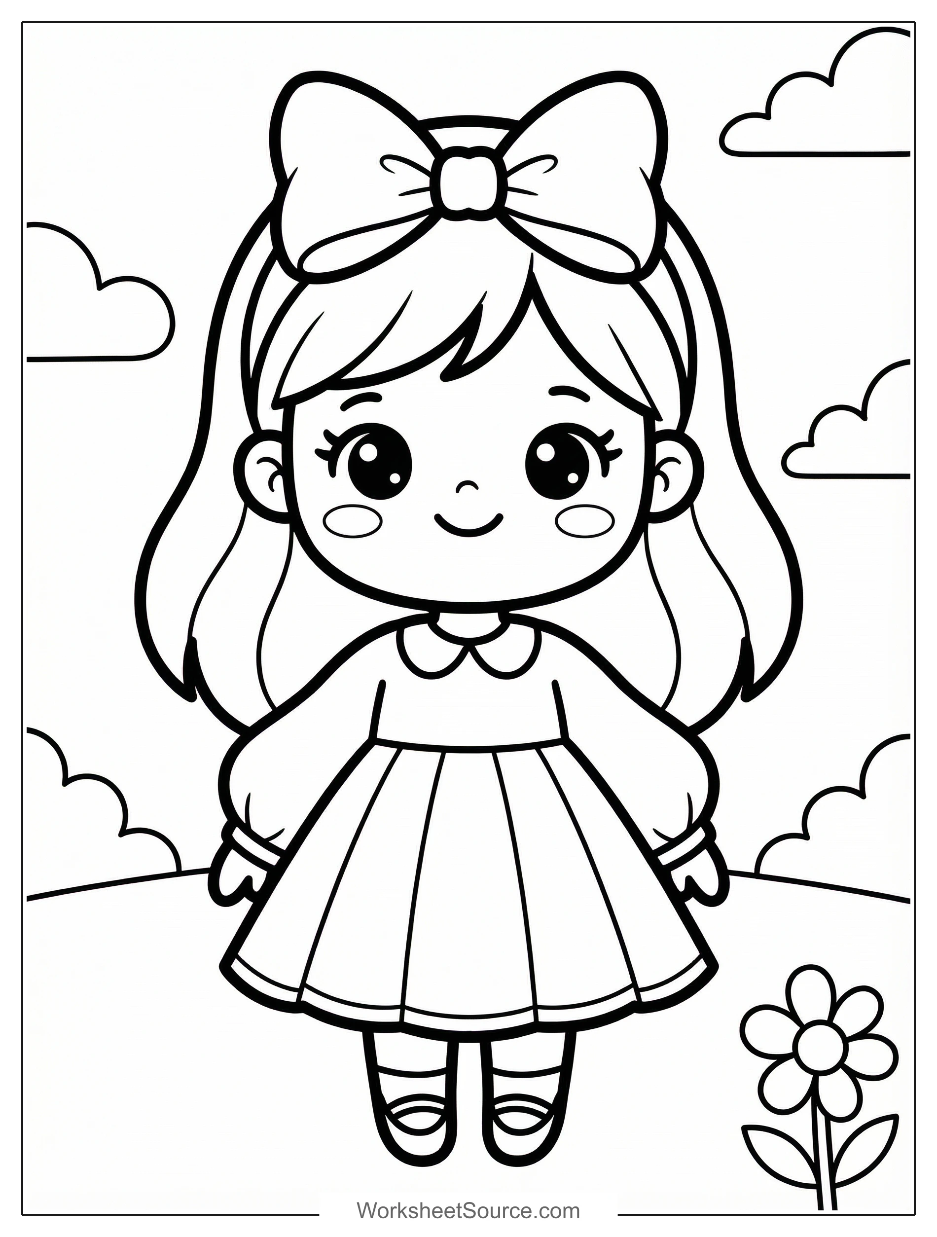 Try soft pink for the bow and rosy cheeks, pastel blue or lavender for the dress, and darker blue for the shoes. Use a slightly darker shade along the dress folds to show depth, and add light strokes around the hair roots to create soft shading. Finally, color the background with pale sky blue and bright green for the grass to make the kawaii girl pop.