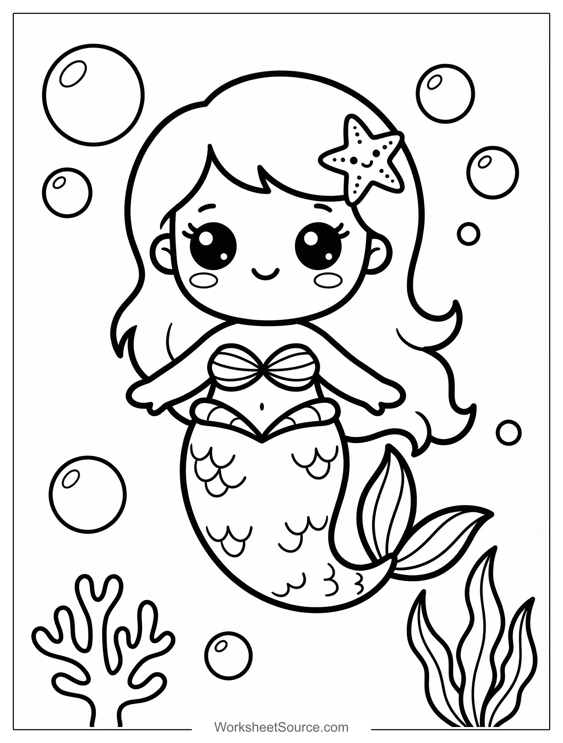 Isn't this Kawaii Mermaid coloring page a cheerful little ocean friend to bring to life? The smiling mermaid, the bubbly scene, and the friendly sea plants invite imaginative choices and storytelling. As you color, you can talk about where mermaids might live, what other animals swim nearby, and how light changes underwater. The scalloped tail is perfect for pattern practice. Try alternating two or three colors to create a shimmering effect. The starfish hair clip and shells are tiny details that encourage careful coloring and focus. In the classroom, this printable works well at a coloring center or as part of a themed bulletin board. At home, it is a calming rainy-day activity or a quiet after-school project. For a creative extension, ask children to name their mermaid, write a short sentence about her adventures, or glue on sequins for extra sparkle. This free printable Kawaii Mermaid coloring page is both a lovely art piece and a playful prompt for stories and ocean learning.
