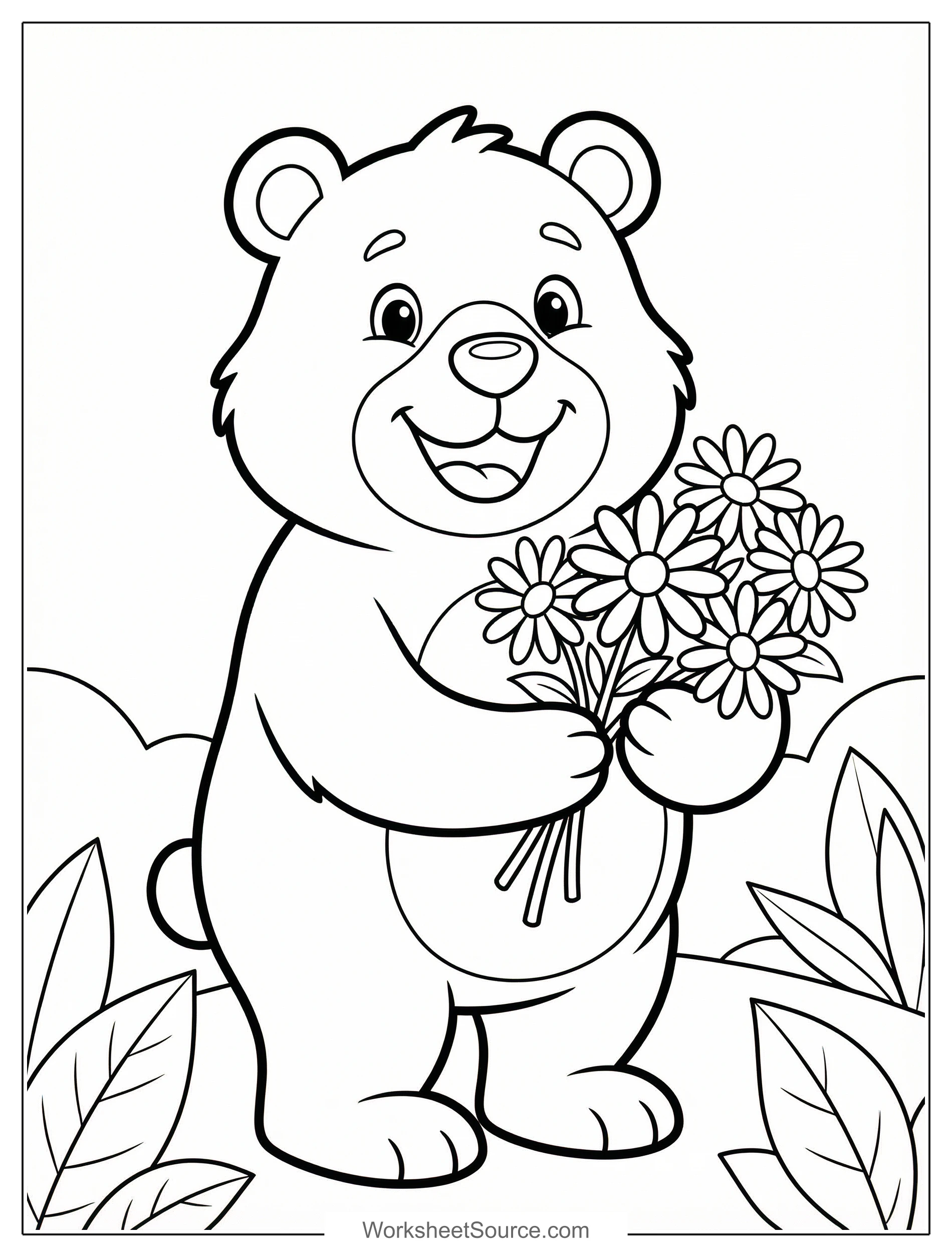 Try coloring the daisies with bright yellow centers and white petals, and add light blue or soft pink shadows to the petals for depth. Color the stems and leaves in different greens, and use brown or tan for the bear. Add a darker shade around the edges to make the bear look round and soft. Use crayons for bold color and colored pencils to blend and add small details.