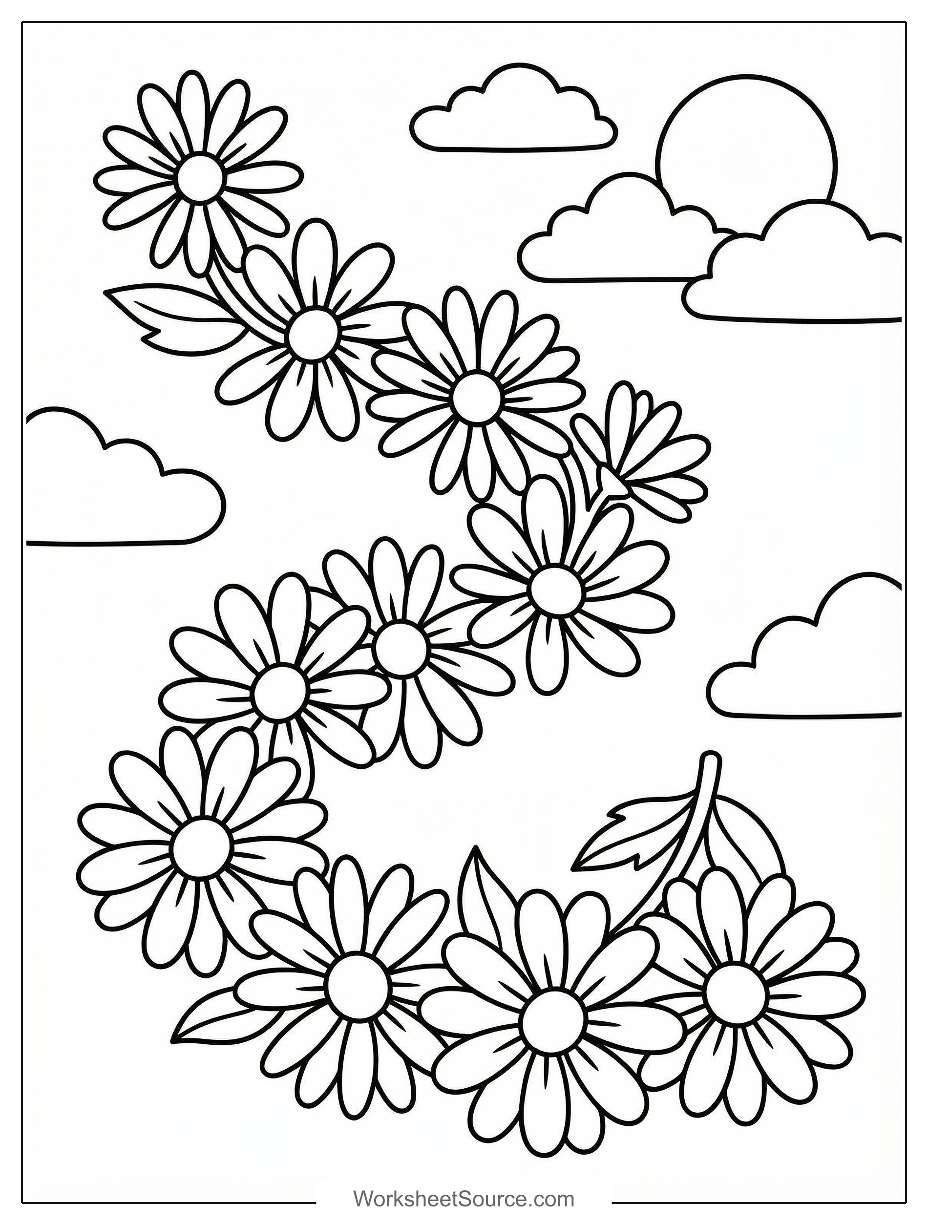 This Daisy Chain coloring page is a cheerful way to bring nature into art time, and it invites imagination with a simple trail of blooming flowers. Picture a sunny meadow as you color each petal, and encourage kids to choose color themes like sunrise pastels or bold garden hues. In the classroom, try a center where children color and then arrange their pages into a floral mural for a bulletin board display. At home, use the page for a quiet afternoon activity, and then ask children to write a short story about where the daisy chain leads. For a group project, cut out flowers and connect them to make a real paper garland, or pair the printable with a read aloud about gardens and plant life. The image offers plenty of repetition for practicing fine-motor control and color choices, and the simple sky details let artists experiment with gradients and cloud shading. Overall, this printable Daisy Chain coloring page is free, inviting, and easy to adapt for many creative lessons and family moments.