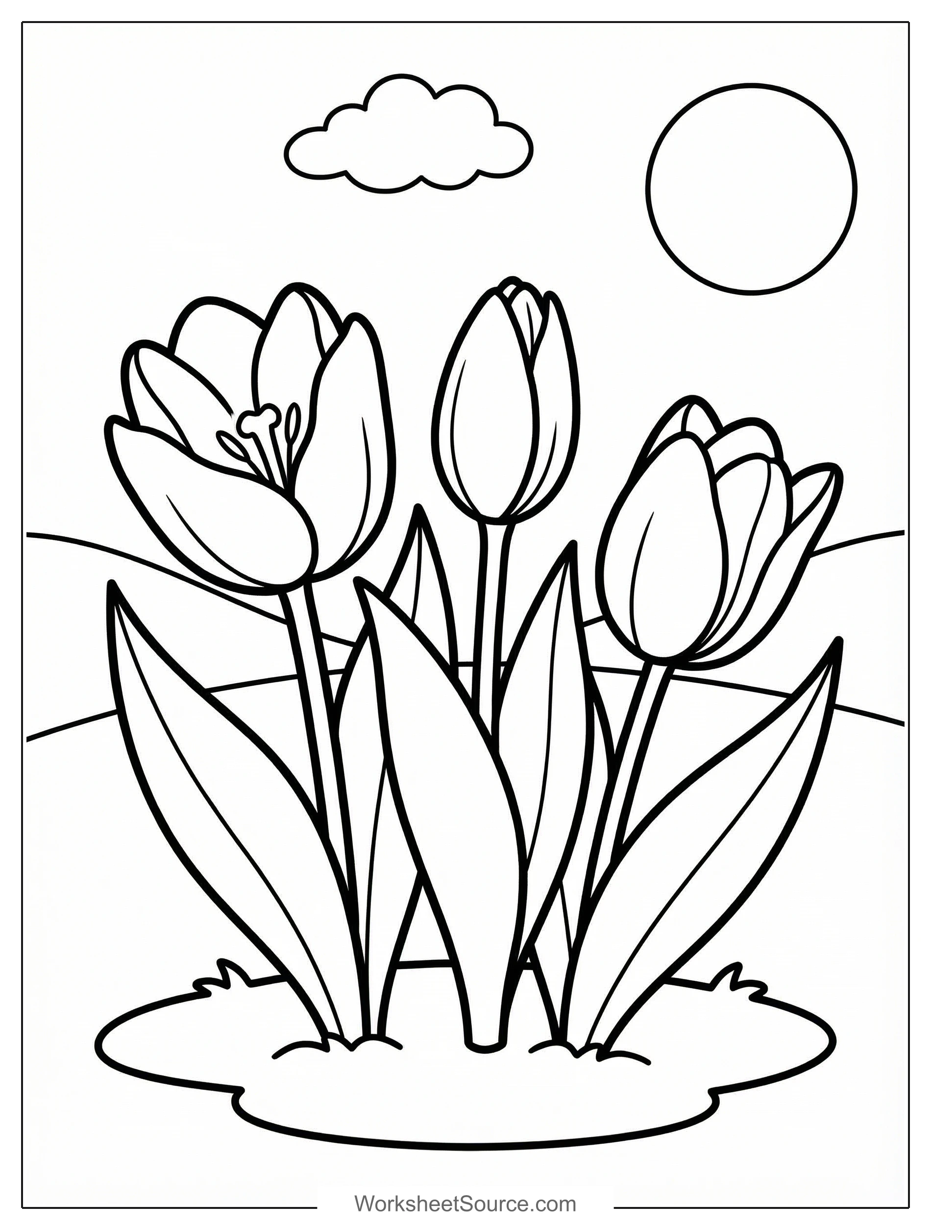Download this free printable Spring Tulips coloring page for kids. Great for classroom activities, home learning, and creative fun.