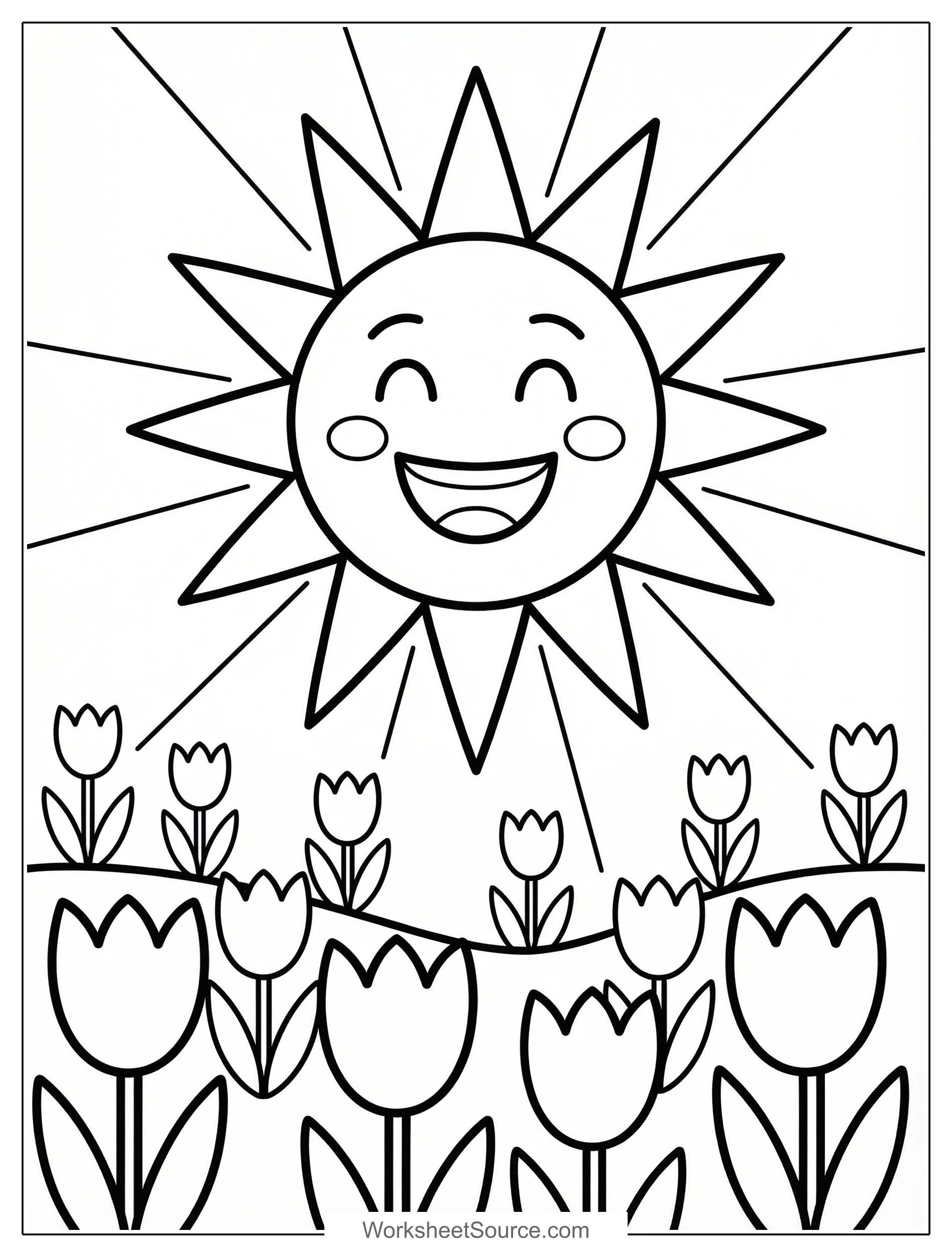 Try using bright red, pink, and yellow for the tulips, and alternate colors to make rows pop. Color the leaves and stems in shades of green, and add light green highlights to show sunlight. For the sun, use golden yellow and add orange around the edges to show warmth and depth.