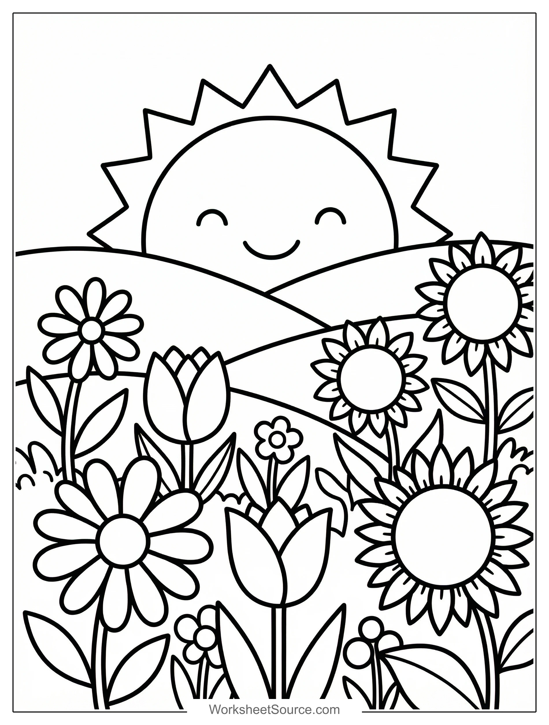Use bright yellows and oranges for the sun and sunflowers, and try soft pinks, purples, and blues for the smaller wildflowers. Shade the hills with light green at the top and darker green at the bottom to show depth, and add small dots or lines in the flower centers to create texture. Encourage blending with crayons or colored pencils by layering light colors first and then adding darker strokes gently for shadow.