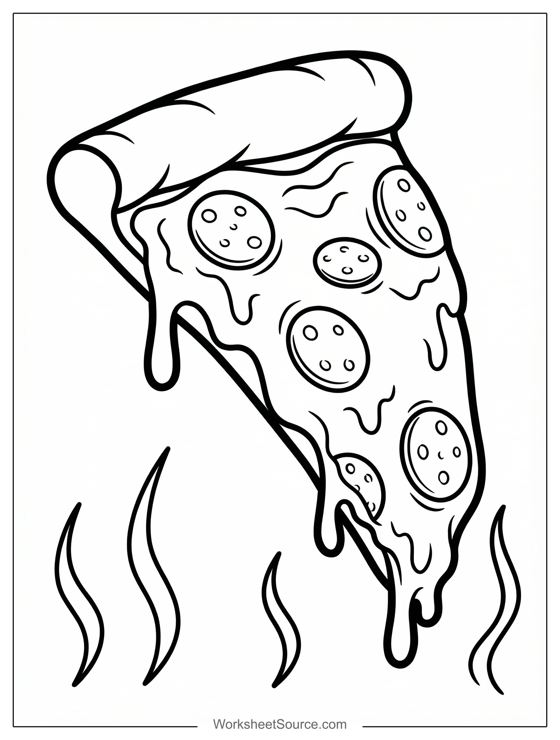 Pizza Slice Pepperoni coloring page fun is a great way to mix creativity and simple learning. Imagine the steam rising from a slice and the gooey cheese stretching between toppings as kids choose colors. Talk about where pizza comes from and the ingredients that make it tasty, like cheese, sauce, and pepperoni. In a classroom, try a pizza station where children color slices and then assemble a paper pie for a group mural. At home, this printable makes a cozy rainy day activity and a prompt for storytelling about favorite toppings. For a writing extension, ask children to name their dream pizza and draw extra toppings around the slice, or create a menu with prices and pretend to run a pizza shop. Use the page for color matching, counting pepperoni pieces, and sequencing the steps to make pizza. This printable is free and versatile. It fits art centers, bulletin boards, party crafts, and calm down corners, and it invites imagination and tasty conversation.