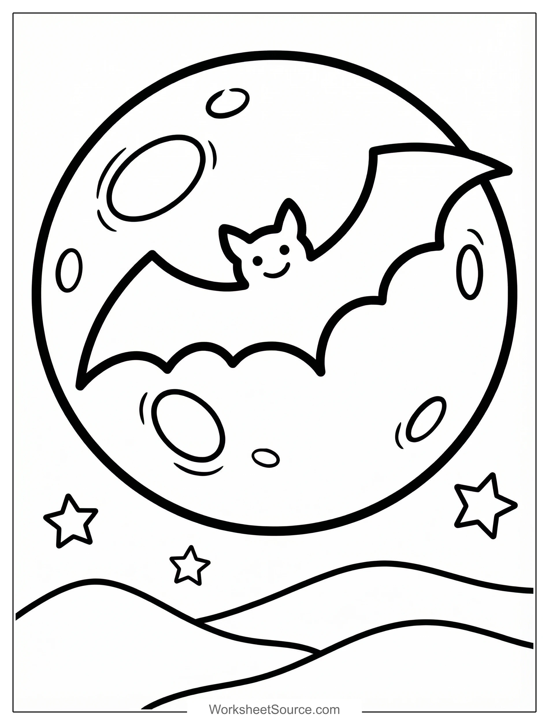 Try filling the moon with pale yellow or soft cream, and add light gray for craters to show texture. Color the bat deep black or dark purple, and add a lighter purple or blue for wing highlights to show shape. Use a white crayon or gel pen to add tiny star dots in the sky to make your scene sparkle.