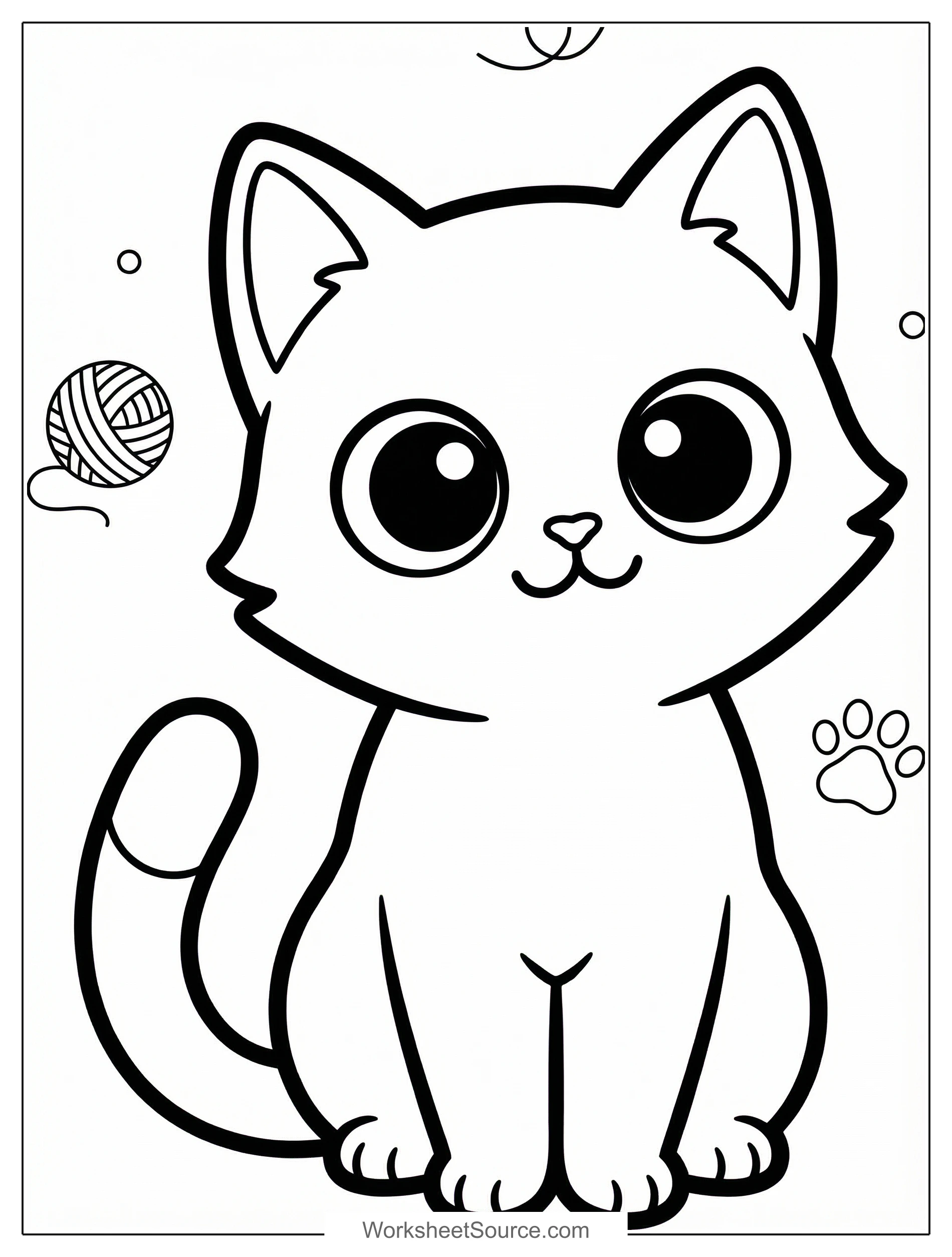 Try coloring the cat body with dark black or charcoal, and add light gray highlights along the edges to show shine. Use bright green or gold for the eyes to make them pop, and color the yarn ball with contrasting colors like orange and purple for a Halloween feel. Add soft strokes around the paw prints to suggest shadow and make the picture look lively.
