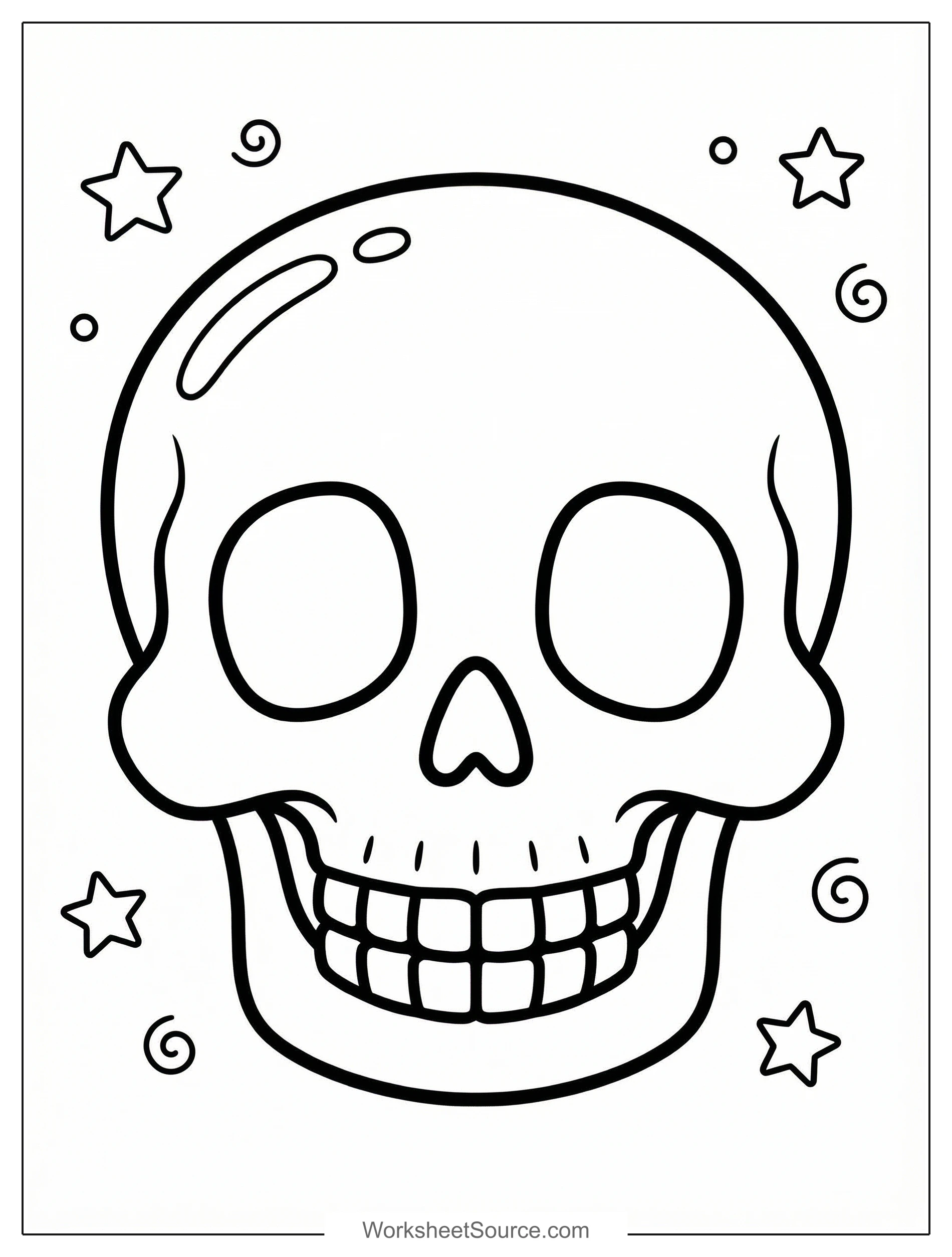 Coloring a Skeleton Head coloring page can be a surprisingly fun way to explore shape, contrast, and imagination. Start by noticing the large eye sockets and the rounded cheekbones, and talk about how artists use light and dark to show form. The teeth offer a great chance to practice careful coloring and fine-motor control, while the surrounding stars and swirls invite creative color choices. In the classroom, try a shared center where each student colors one small section, then assemble a spooky mural for a bulletin board. At home, it makes a cozy rainy day project; pair it with a story about gentle spooky themes or a simple science book about bones for extension. For a group activity, try a color swap game where children trade pages and add new patterns. Parents and teachers can encourage mixing blues and purples in the shadows to create a friendly eerie look, or bright oranges and greens for a playful Halloween vibe. This printable is free and easy to copy, so you can use it again and again.
