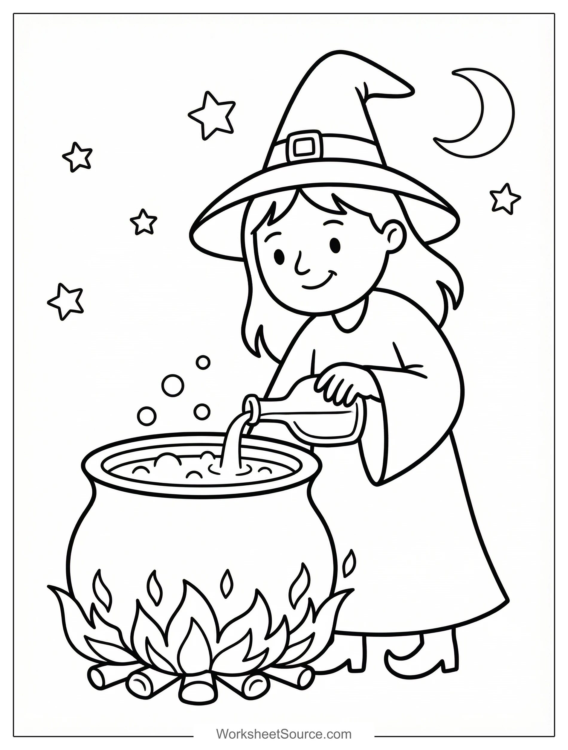 Download this free printable Witch Making Potion coloring page for kids. Great for classroom activities, home learning, and creative fun.