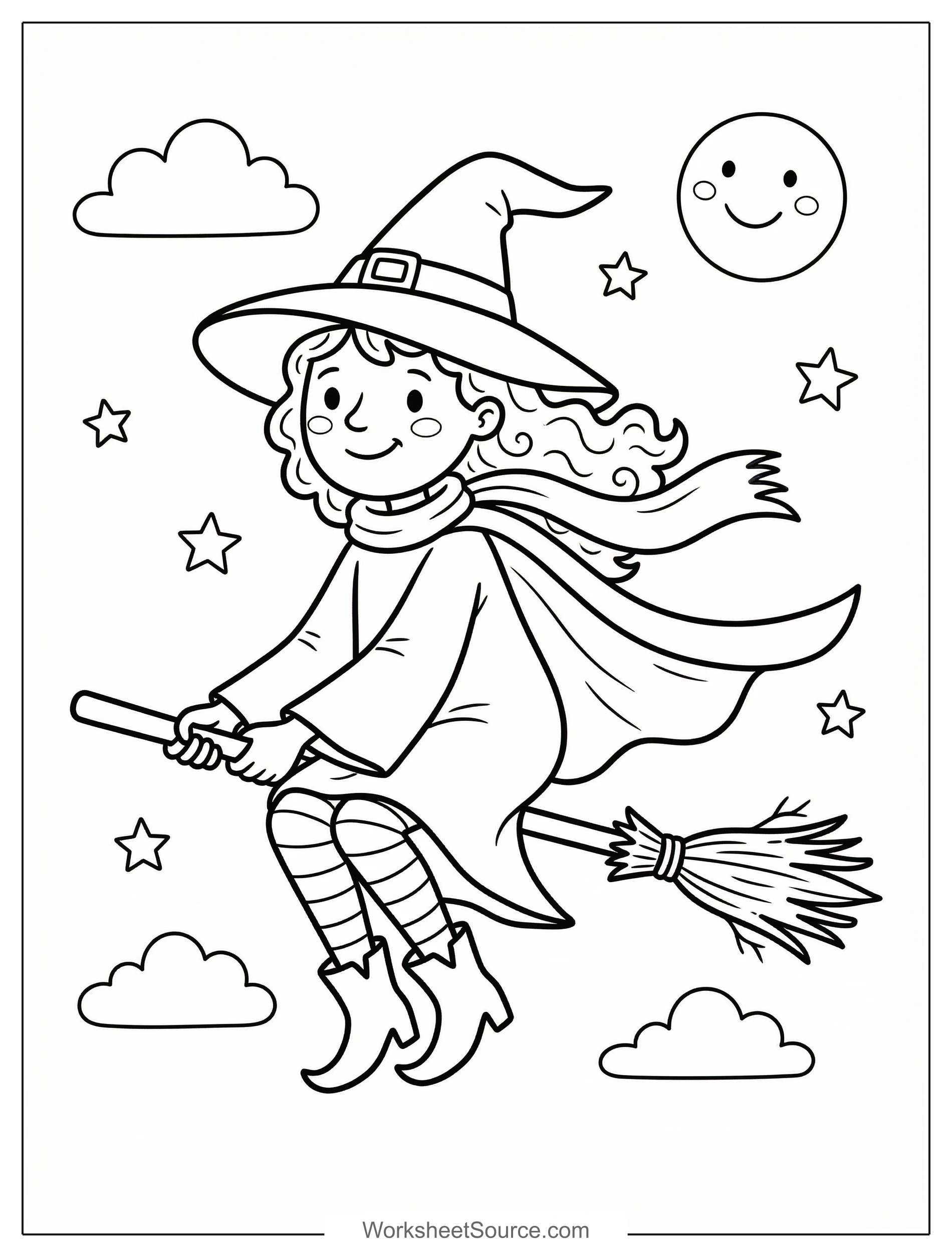 Download this free printable Witch With Broom coloring page for kids. Great for classroom activities, home learning, and creative fun.