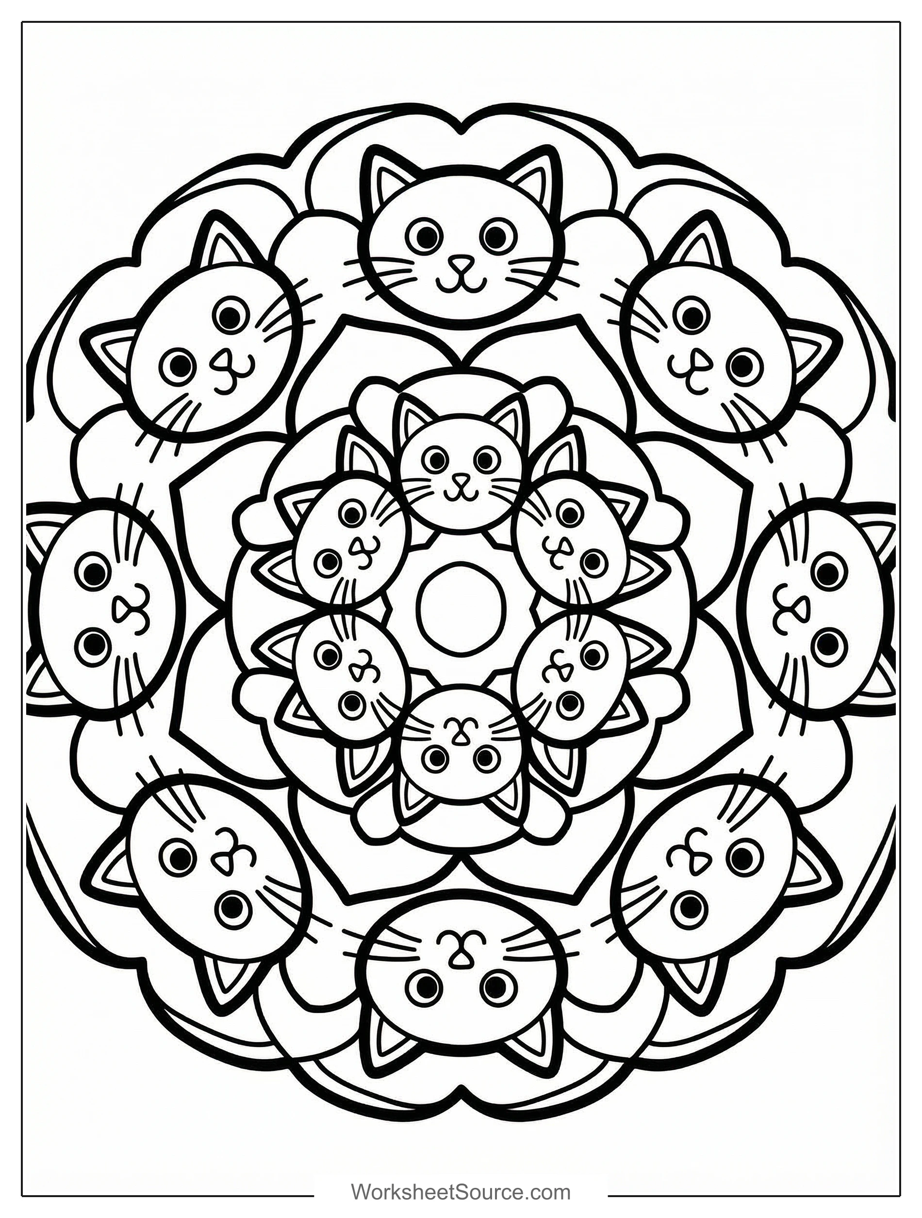 Use warm colors like oranges and yellows for the cat faces, and cool blues and purples for the background to make the cats pop. Try coloring repeating sections the same color to create a pattern, and add light strokes around faces to suggest shading and roundness. Encourage using fine-tip markers for small details and crayons for larger sections to mix textures and make the mandala vibrant.