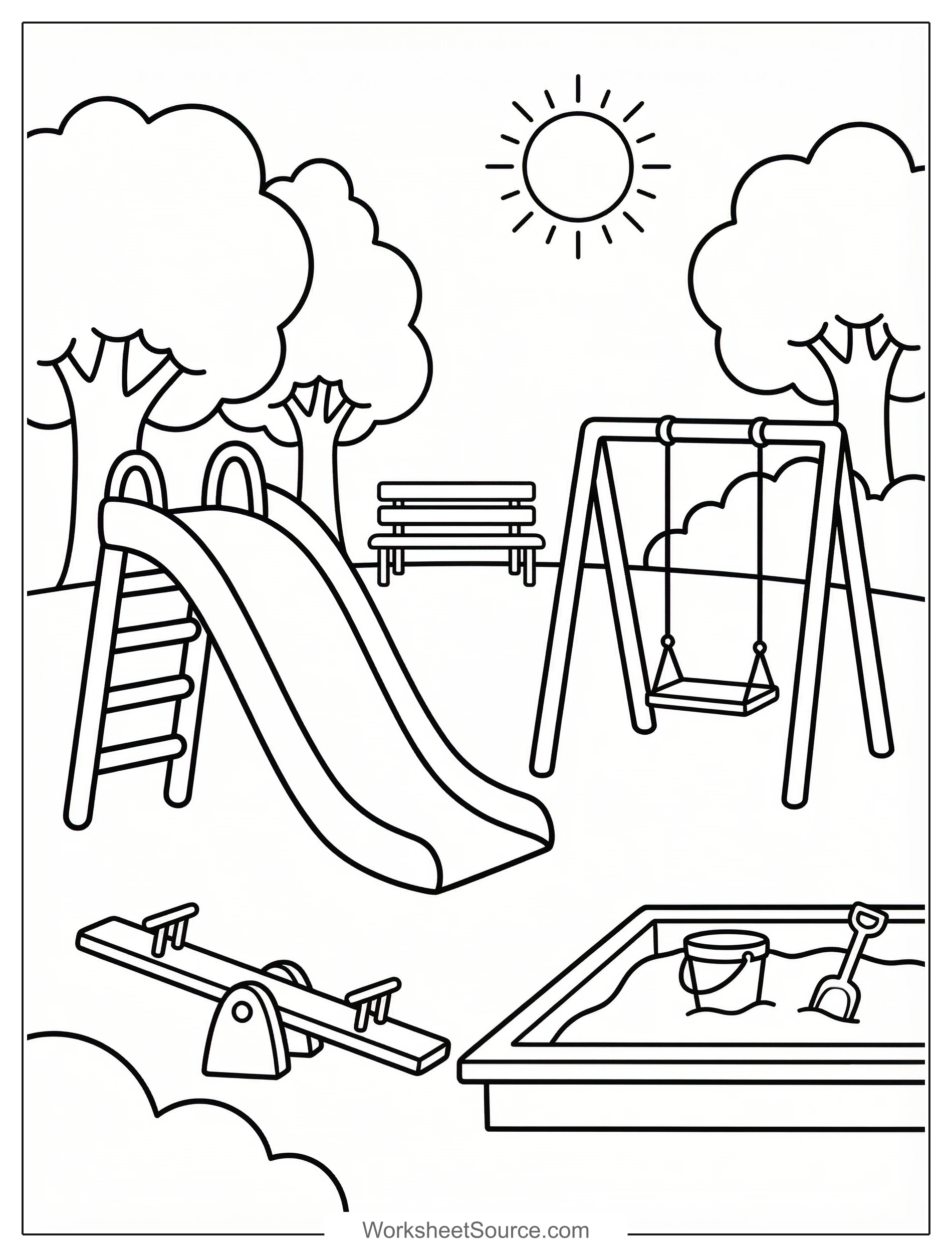 Download this free printable Park Scene With Playground coloring page for kids. Great for classroom activities, home learning, and creative fun.