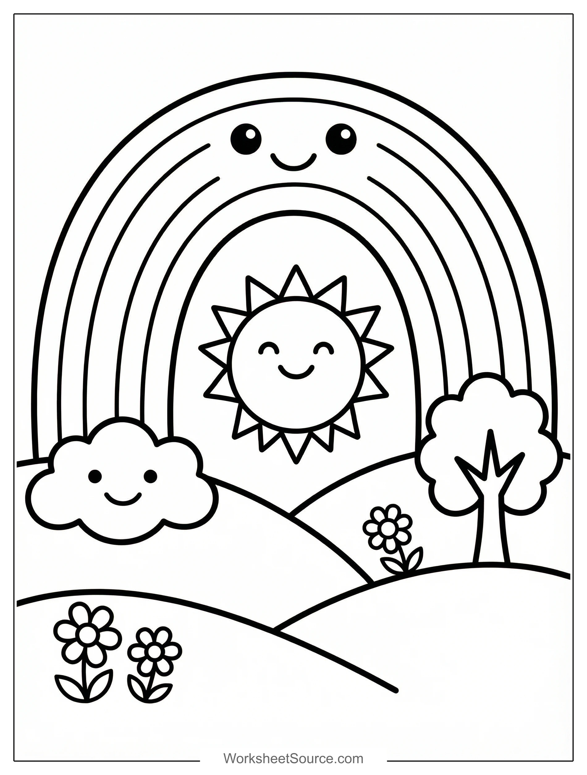 What a cheerful Rainbow In Nature coloring page. This scene invites imagination and outdoor wonder and is a perfect printable to brighten a rainy day. Imagine the sun smiling between the rainbow bands, and talk about how rain and sunlight work together to make real rainbows. In a classroom center you can pair the page with a short story about storms and sunshine, or use it for a bulletin board full of colorful student work. At home it is a calm activity for quiet time, and families can make a game of naming hues or mixing markers to find new shades. For creative extensions, try having kids write a short sentence about what they see or cut out the finished page to create a rainbow collage with tissue paper. Teachers can use the page as a spring themed printable for centers, and parents can tuck it into backpacks as a travel activity. This page is free, printable, and ready to spark color exploration and conversation about nature.