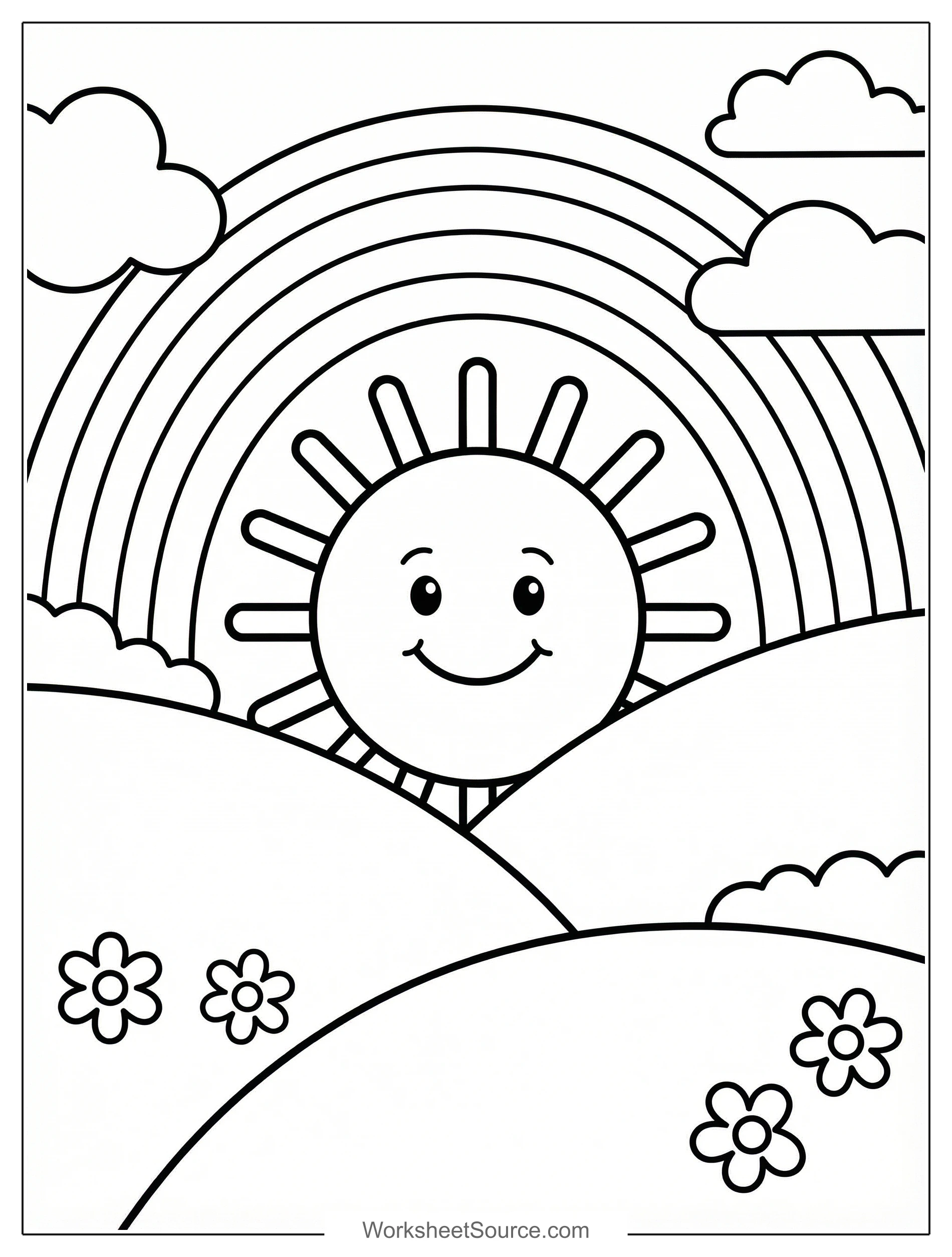 What a cheerful scene to color. The Rainbow Over Hills coloring page invites imagination and a little bit of storytelling as children choose colors and create a mood. Talk about how rainbows appear after rain and how sunlight and water drops work together to make those bright arcs in the sky. The smiling sun and gentle hills are perfect for a classroom center where students can practice color order, patterning, and neat coloring habits. At home, this printable is a lovely rainy afternoon project, and you can pair it with a picture book about weather or a short writing prompt about where the rainbow might lead. For a group project, try a bulletin board where each child colors a level of the rainbow and then assemble them into one big display. Encourage kids to experiment with blending for the sky and to invent patterns for the flowers so each little hill feels unique. This simple scene becomes a springboard for creativity, conversation, and hands-on fun.
