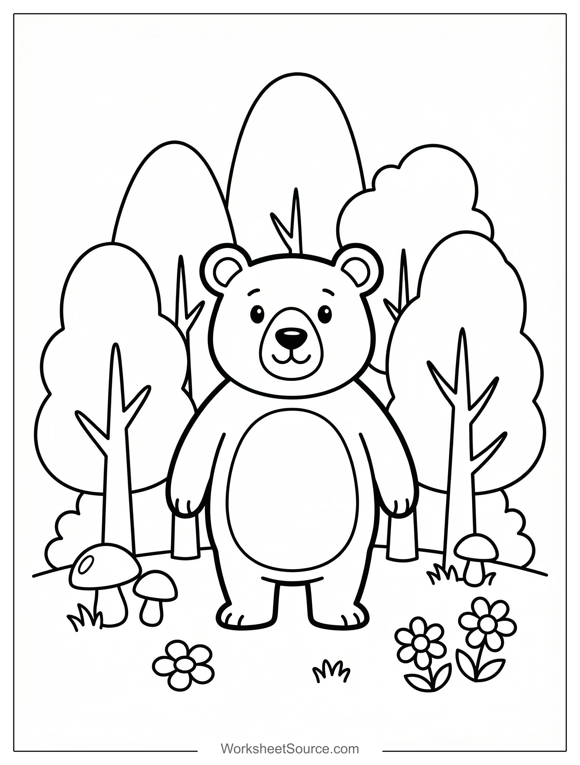 Coloring a Forest Trees coloring page is a cozy way to bring the outdoors inside. Picture tall trees with layered leaves, soft mushrooms by the roots, and a friendly bear standing among flowers. This page invites kids to explore color choices, from deep evergreen to bright spring greens, and to imagine what lives under the leaves. It is fun to turn the activity into a classroom center, pin finished pages on a bulletin board, or use the sheets for a small group nature study. At home, these pages brighten a rainy afternoon and spark conversations about seasons and habitats. Try pairing the printable with a short story about forest animals, create a matching game with leaf shapes, or have children write a sentence about what the bear might be doing. Encourage creative extensions like adding birds in the sky or a stream around the trees. This project blends playful creativity with hands-on learning, and it makes a simple printable feel like a mini nature adventure.
