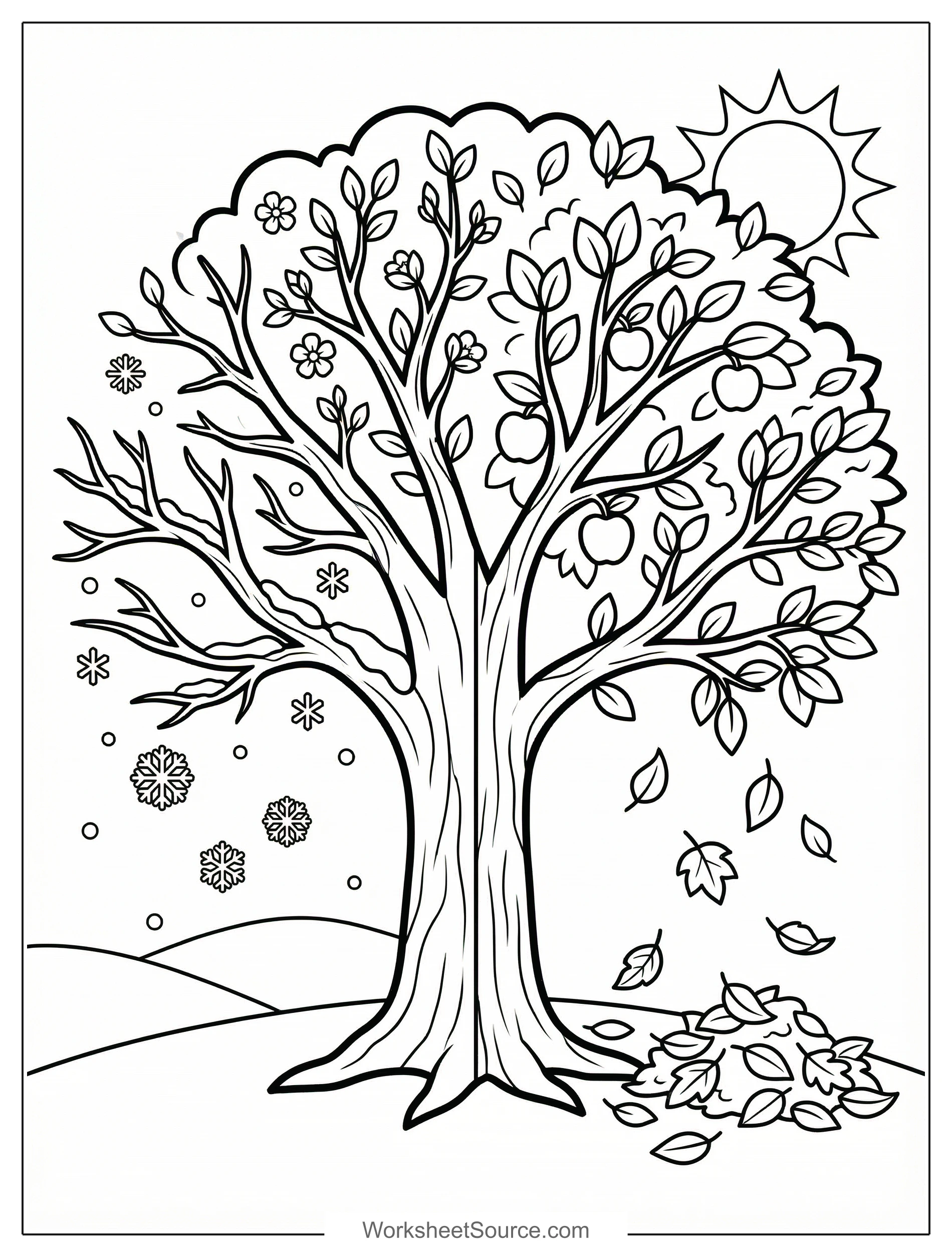 Download this free printable Tree In Seasons coloring page for kids. Great for classroom activities, home learning, and creative fun.
