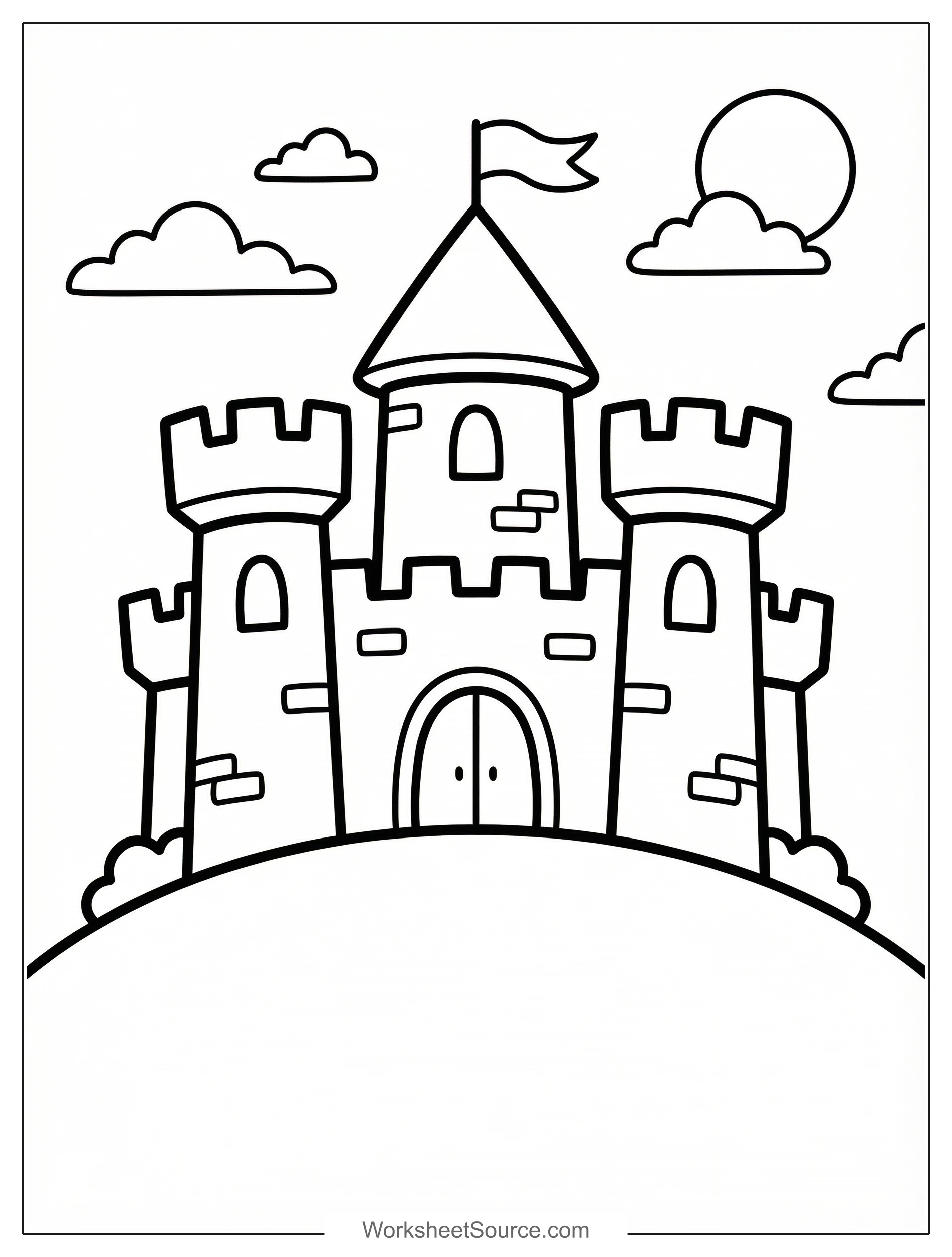 Download this free printable Castle On Hill coloring page for kids. Great for classroom activities, home learning, and creative fun.