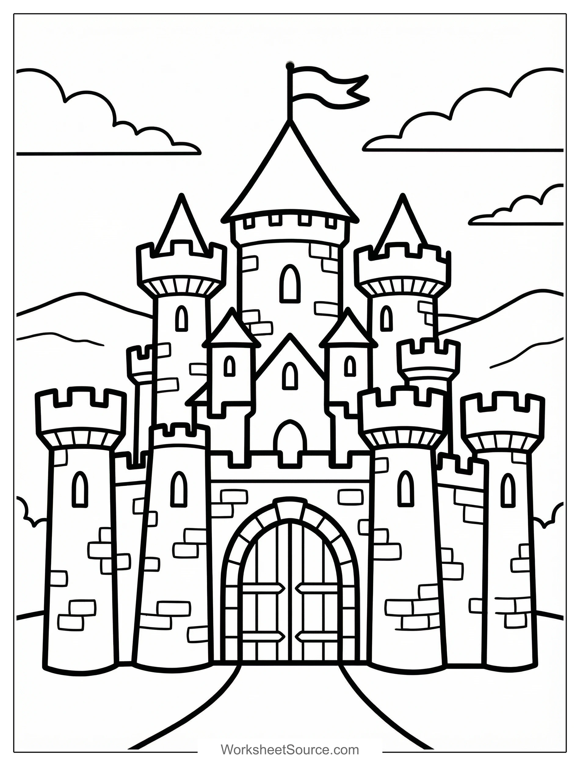 This Medieval Castle coloring page is a playful way to explore history and imagination at the same time. Picture turrets and towers in bright colors, and encourage children to think about how a real castle looked long ago, with strong walls, tall towers, and flags that flew in the wind. Use the printable during a story center to pair with fairy tale books, or hang finished pages on a classroom bulletin board to create a kingdom gallery. At home, try a family project where each person colors one tower and then you assemble a castle mural. For a creative extension, invite kids to write a short scene about who lives in the castle, or add paper flags and cotton cloud accents to give the scene depth. In group projects, assign roles like artist, writer, and decorator to make teamwork fun. This free printable is a handy resource for rainy day activities, quiet time, and classroom centers, and it helps bring medieval scenes to life with color and imagination.