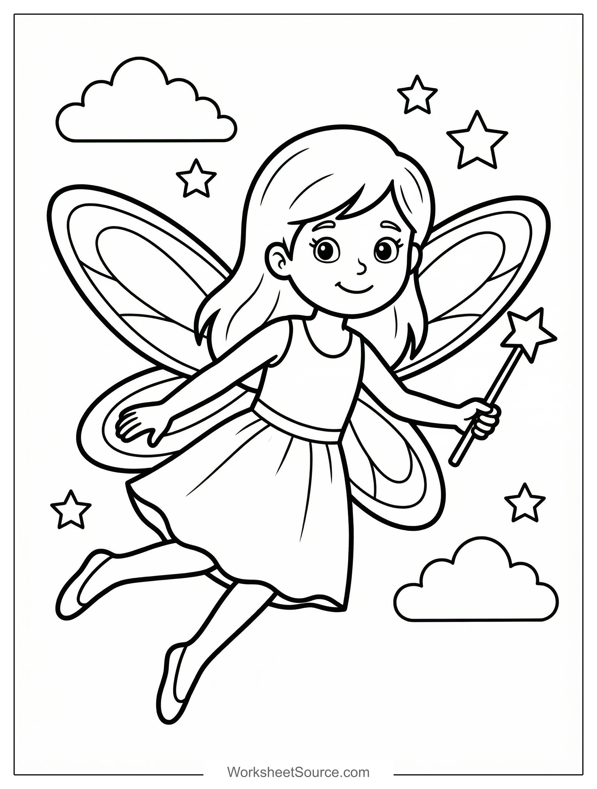 Download this free printable Fairy Flying coloring page for kids. It is great for classroom activities, home learning, and creative fun.