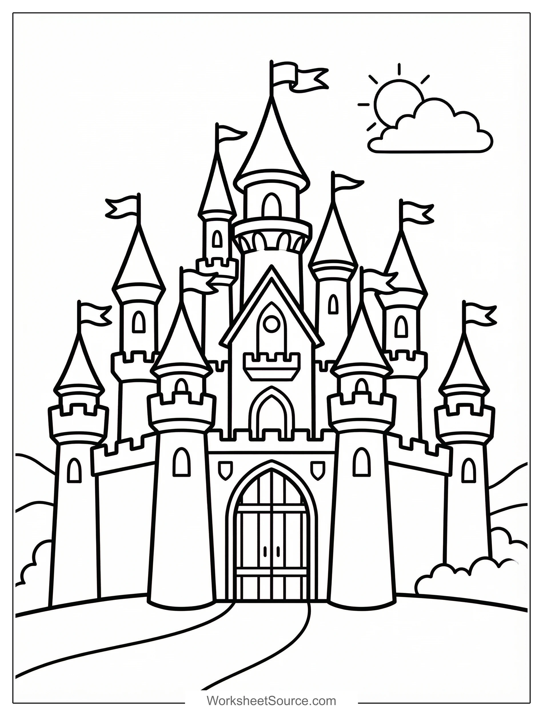 Download this free printable Grand Castle With Towers and Flags coloring page for kids. It is great for classroom activities, home learning, and creative fun.
