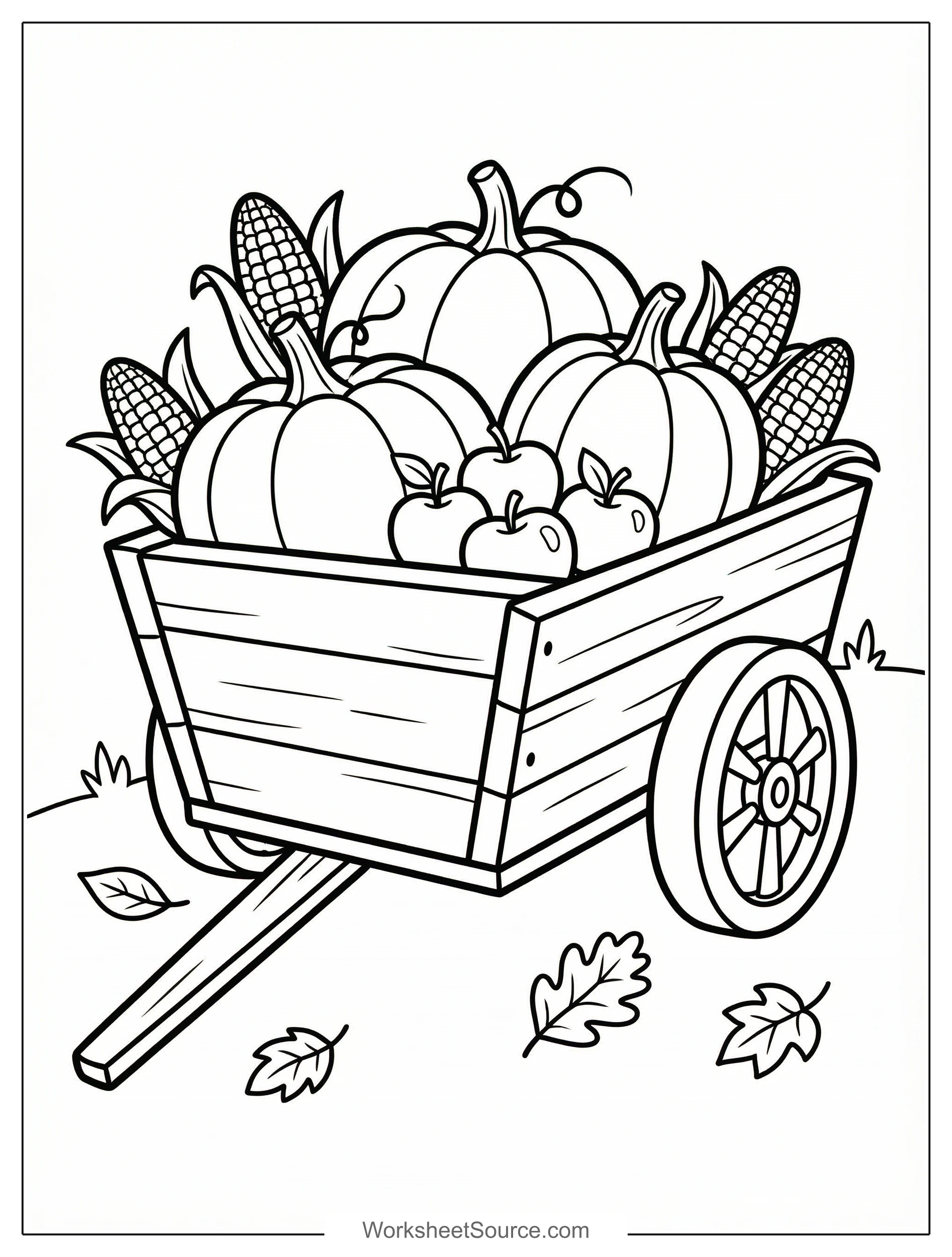 Use bright orange for the pumpkins, and add darker orange along the ridges to show roundness. Color the corn yellow and add light brown for the husks. Use brown or gray for the wooden wagon and add a darker shade along the edges for shadow. Try layering crayons gently to blend colors, and use small circular strokes for texture on the apples and pumpkin stems.