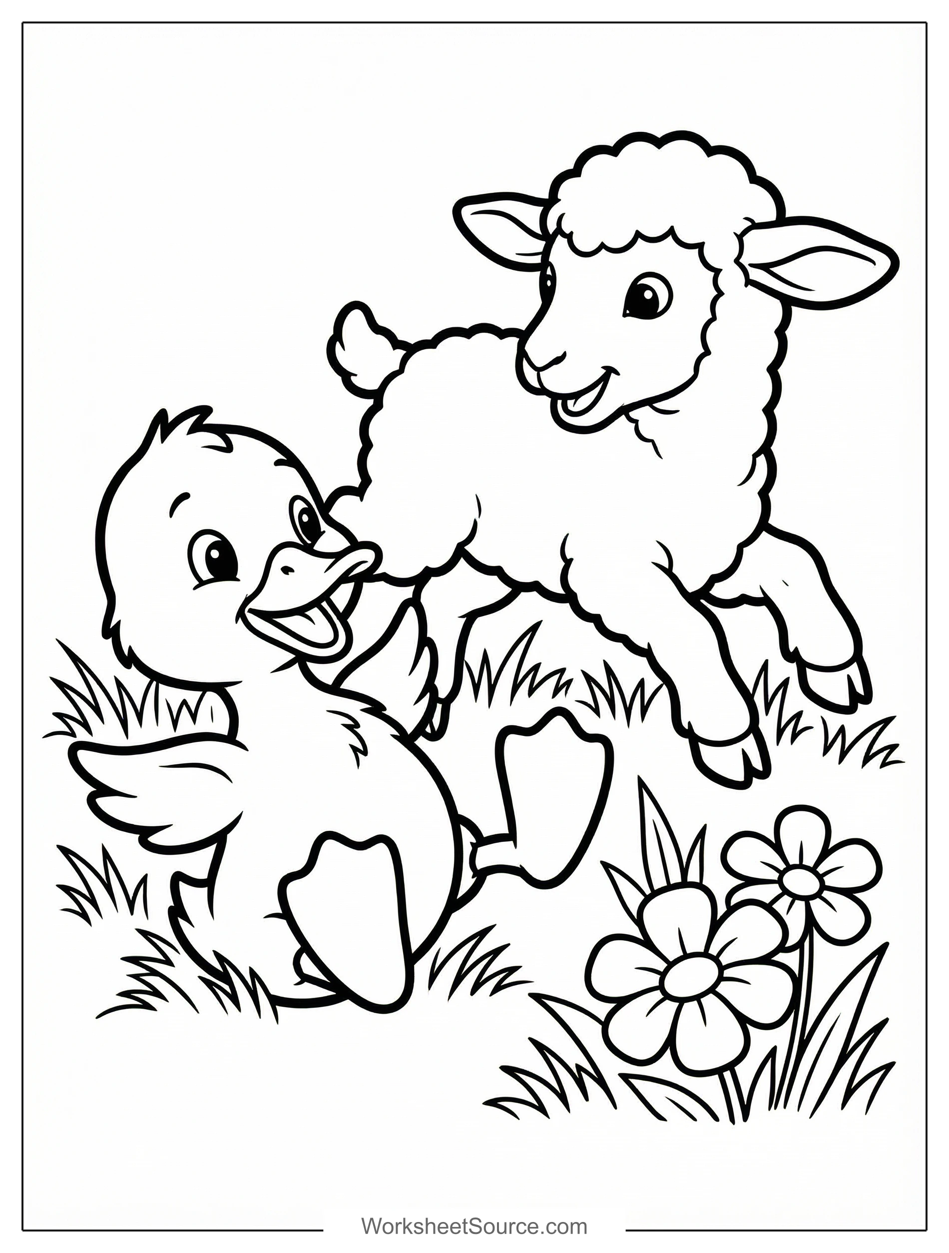 Use soft cream or light gray for the lamb's wool, and add gentle blue shadows to show roundness. Color the duckling bright yellow and use orange for the beak and feet. Fill the grass with two shades of green and use short strokes to show texture. Add color to the flowers with pink and purple petals and a sunny yellow center.