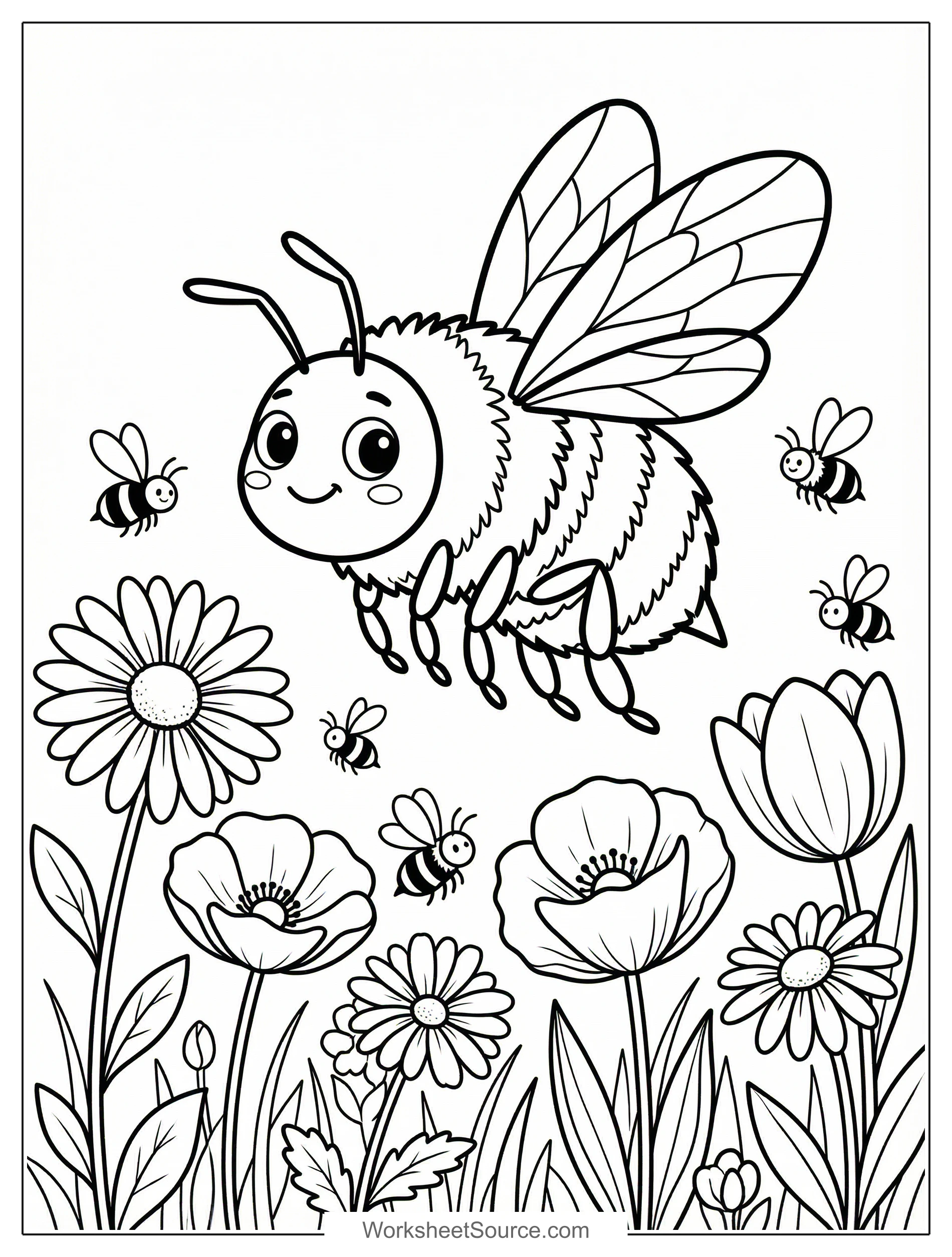 What a joyful Spring Meadow coloring page to bring into your classroom or to your kitchen table. The buzzing bees and blooming flowers invite curious conversation about pollinators and seasons, while leaving lots of room for creative choices. You can use this printable as a quiet table activity, a colorful bulletin board display, or a group project in which each child colors a different flower to make a meadow mural. Talk about the shapes of petals and the patterns on wings as kids choose crayons, markers, or watercolor pencils. Try pairing the page with a short nature walk or a picture book about gardens, and ask children to notice colors they find outside. For an extra twist, have kids add their own bugs or clouds to the scene and write one sentence about a spring adventure. This turns a simple coloring page into a spring learning experience that is easy to share at home and in school, free to print and fun to decorate.