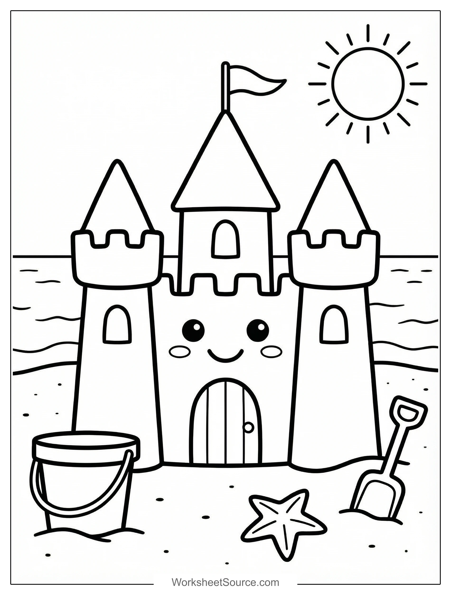 Download this free printable Summer Beach Scene With Sand Castle coloring page for kids. Great for classroom activities, home learning, and creative fun.