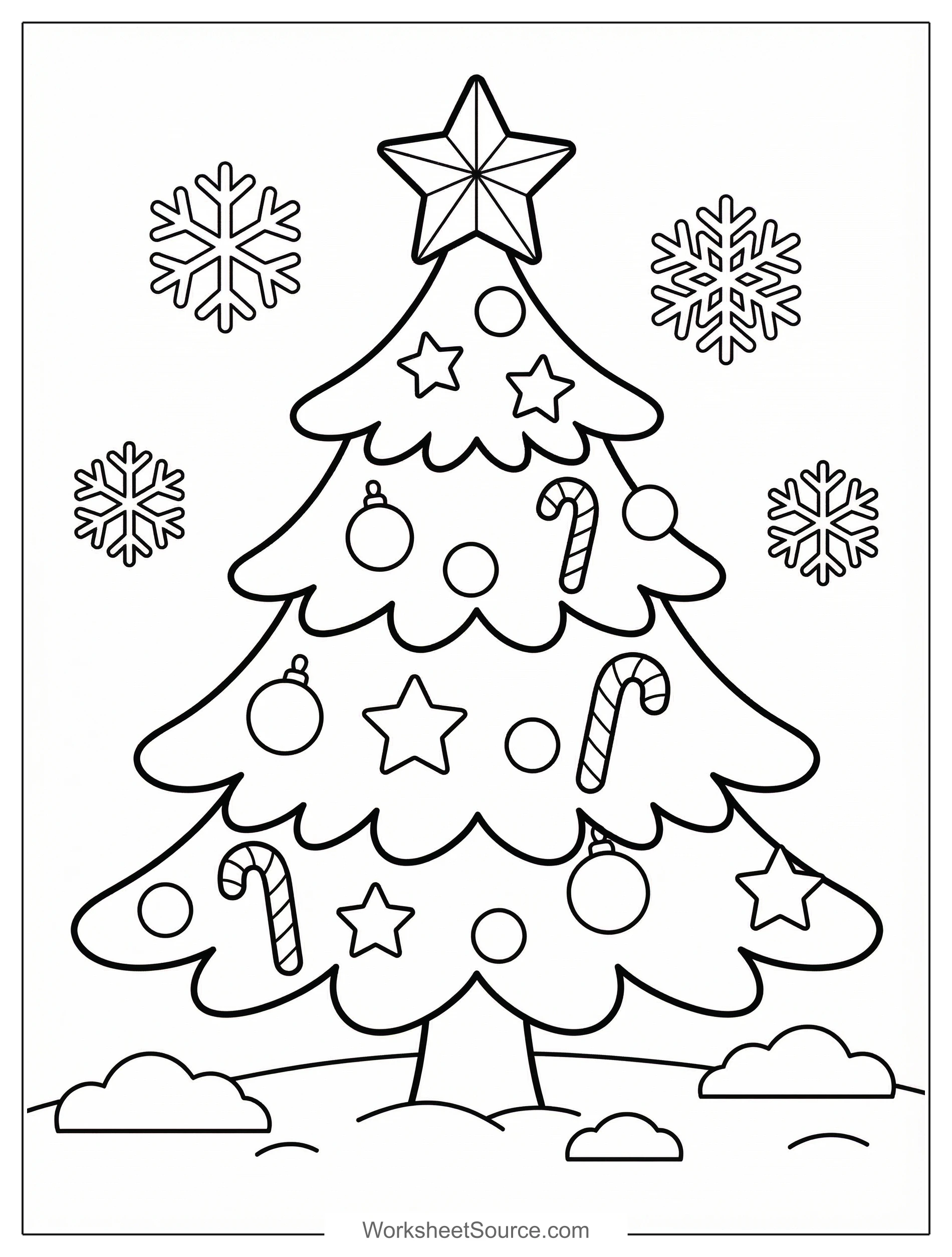 There is something magical about a Christmas Tree With Ornaments coloring page that brings storytelling and creativity together. Picture a sparkly star at the top, round ornaments waiting for bold colors, and candy canes that invite red and white stripes. Coloring this page is a great way to explore patterns as children choose repeating colors for ornaments and stars, and it encourages observation when they mix light and dark shades to show form. In a classroom, this printable works well as a center activity where kids trade pages and compare color choices, or on a bulletin board display that turns individual work into a festive mural. At home, this page is perfect for a cozy afternoon, for pairing with a holiday story, or for making homemade gift tags by cutting out favorite ornaments. Try a group project where each child colors one layer of the tree to create a collaborative design. The free printable format makes it easy to reuse for crafts, seasonal lessons, and imaginative play.