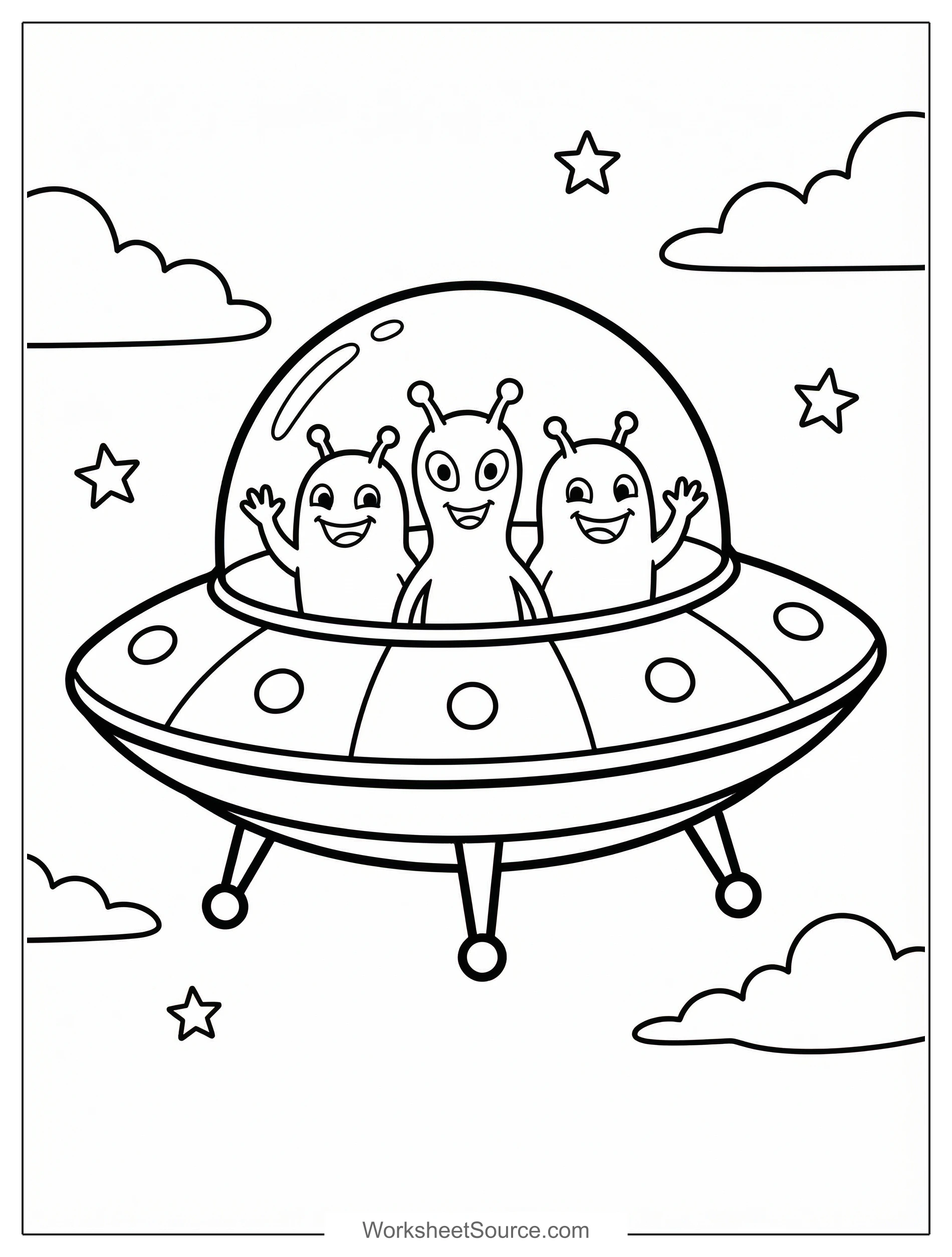 Download this free printable Flying Saucer With Aliens coloring page for kids. Great for classroom activities, home learning, and creative fun.