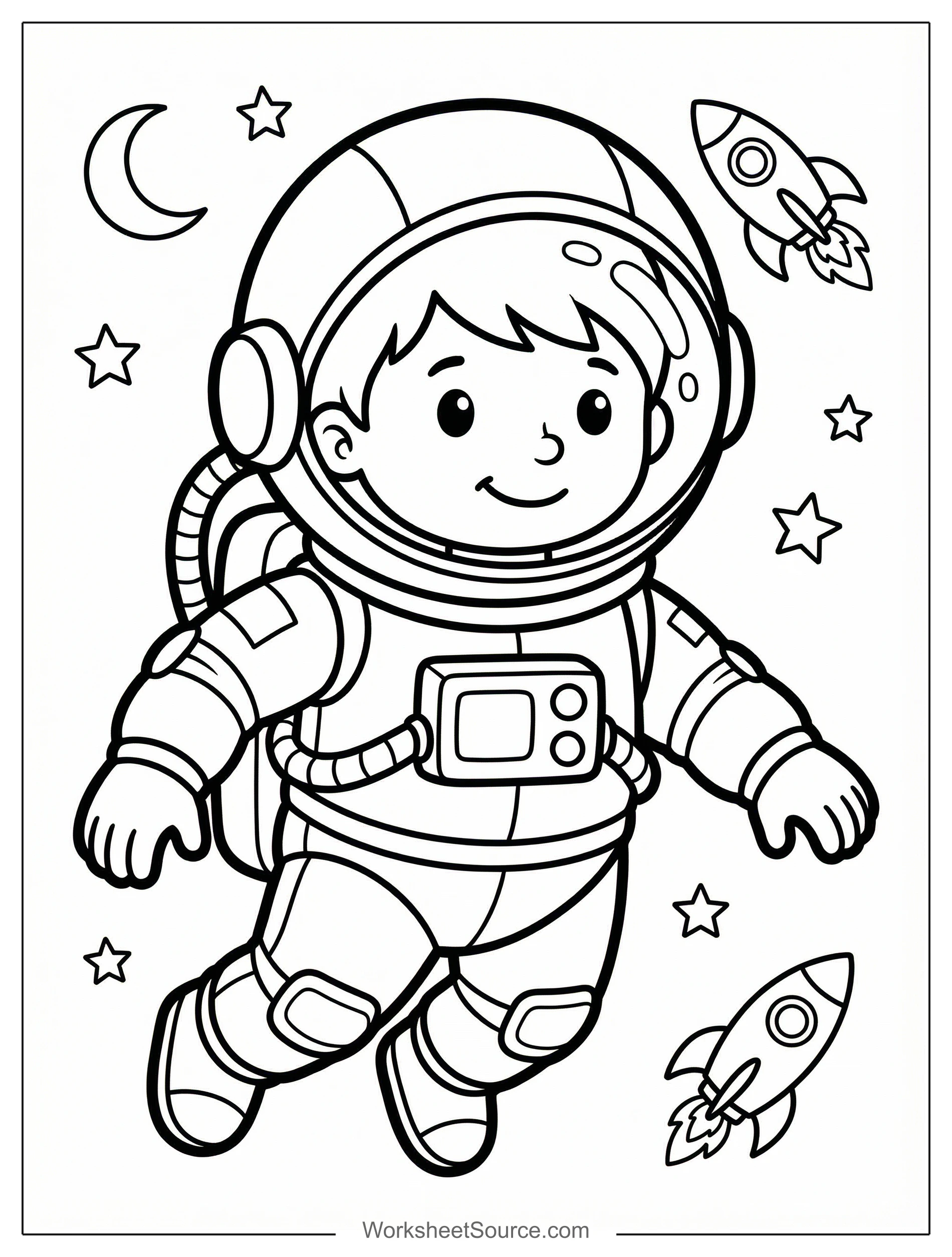 Download this free printable Astronaut In Space Suit coloring page for kids. Great for classroom activities, home learning, and creative fun.