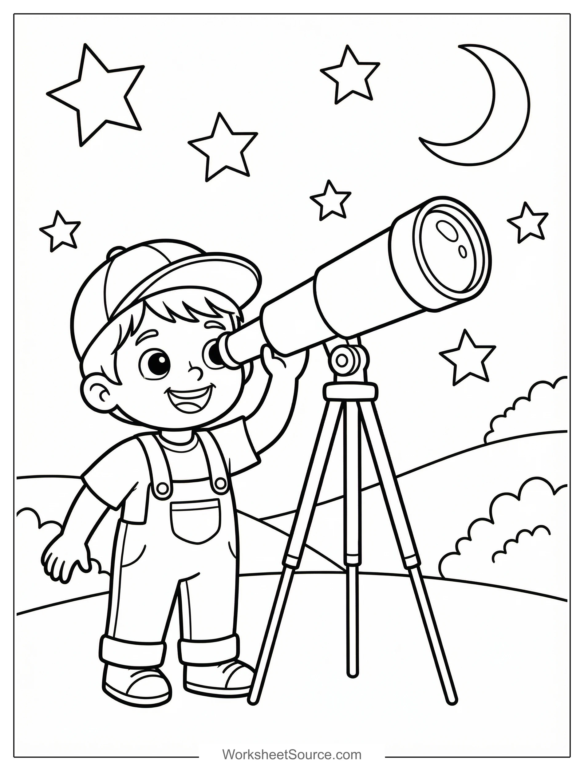 Have fun coloring this Telescope Looking at Stars page while you imagine the night sky. The big telescope and smiling kid invite curious stories about planets, comets, and constellations. Talk about how telescopes help us see farther than our eyes can, and try naming some bright stars or simple constellations as you color them. In the classroom, use this printable as a center activity where children color, then cut out and label a star map, or hang finished pages on a space themed bulletin board. At home, it makes a great rainy day project, and families can turn it into a mini lesson by reading a short book about the moon after coloring. For a creative extension, try pairing the coloring page with a craft telescope made from a paper towel roll, or ask kids to write a short imaginative story about what they would discover through the lens. This free printable is playful and practical, and it sparks questions while providing a colorful way to introduce basic astronomy ideas and observational thinking.